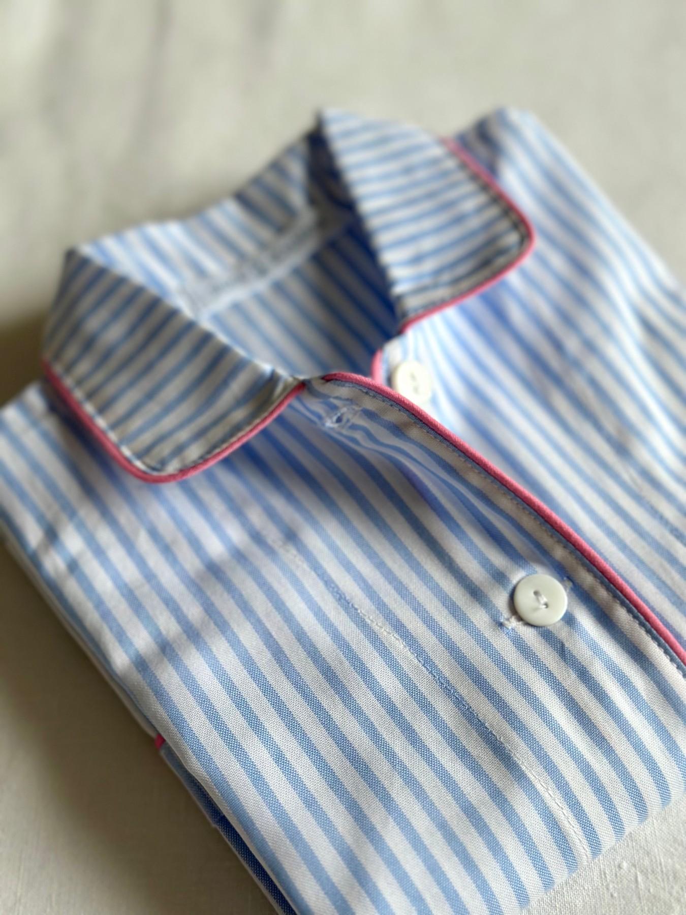 Pure cotton Oxford pajamas. Soft fit. 4-button mother-of-pearl jacket, with 2 pockets and a breast pocket, cotton piping. Trousers with elastic waist.