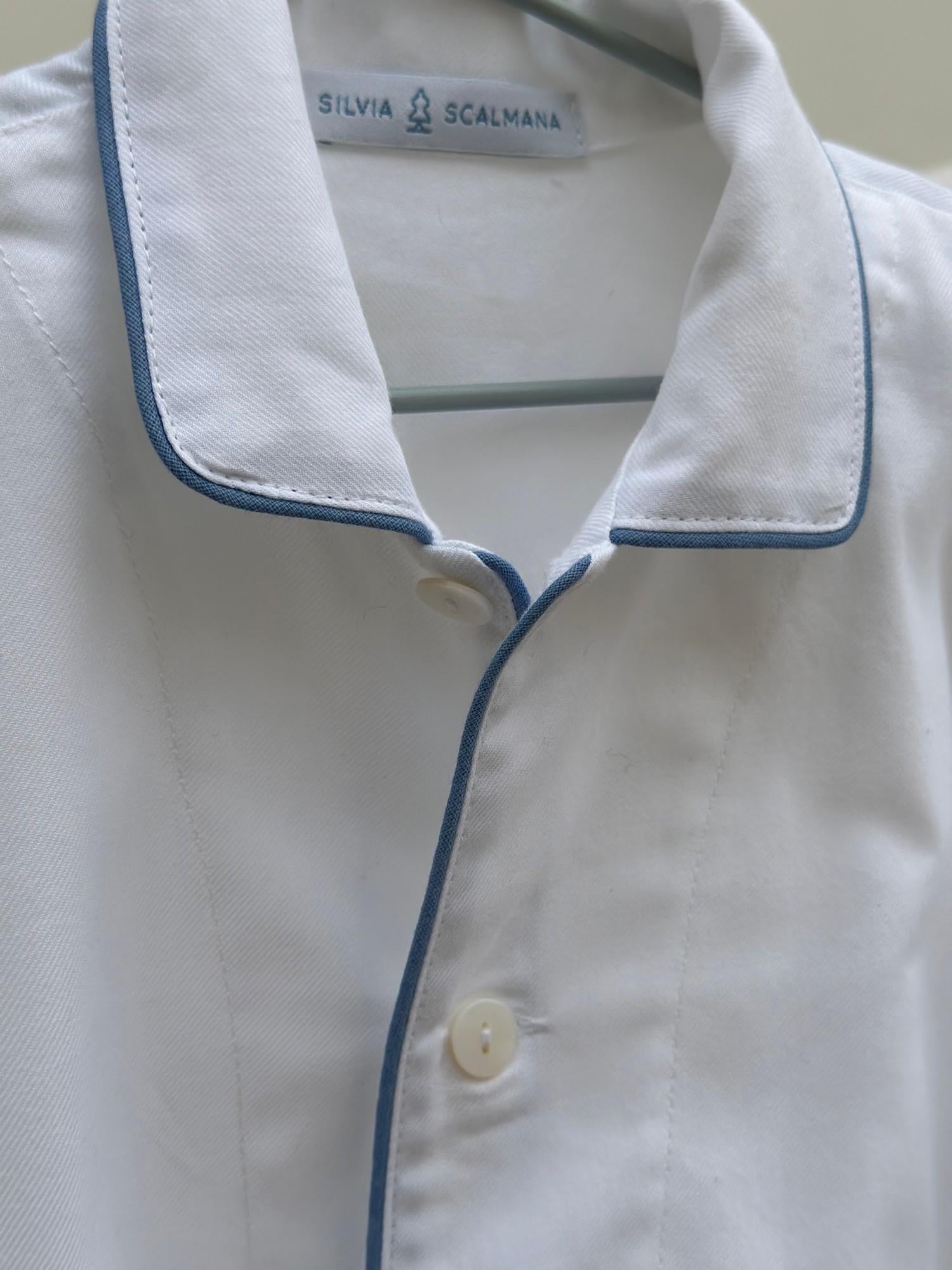 Pigiama bambino in flanella di cotone caldo. Vestibilità morbida. Giacca 4 bottoni in madreperla, con 2 tasche e un taschino, profilo in cotone. Pantalone con elastico in vita.