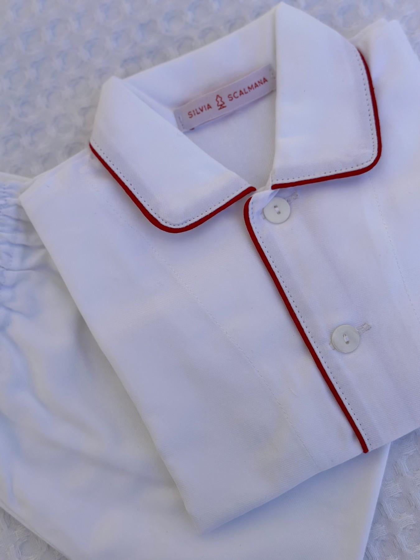 Children's pajamas in pure cotton flannel, with brushed interior. Soft fit. Jacket with 4 mother-of-pearl buttons, with 2 pockets and a breast pocket, cotton profile. Trousers with elastic waist.