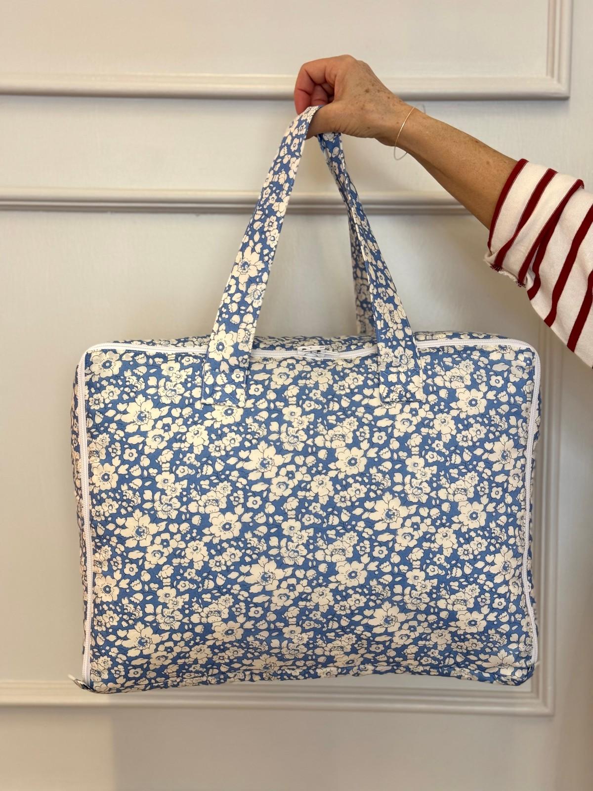 Valigia in tessuto Tana Lawn, disegno "Betsy Boo" di Liberty London, cotone ultrafine dal tocco setoso. Imbottitura in tessuto trapuntato con doppia tasca interna. Dimensioni: 44x34x12 cm