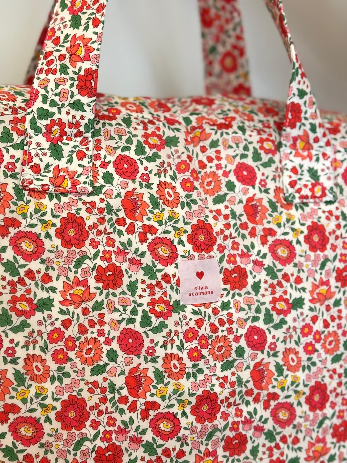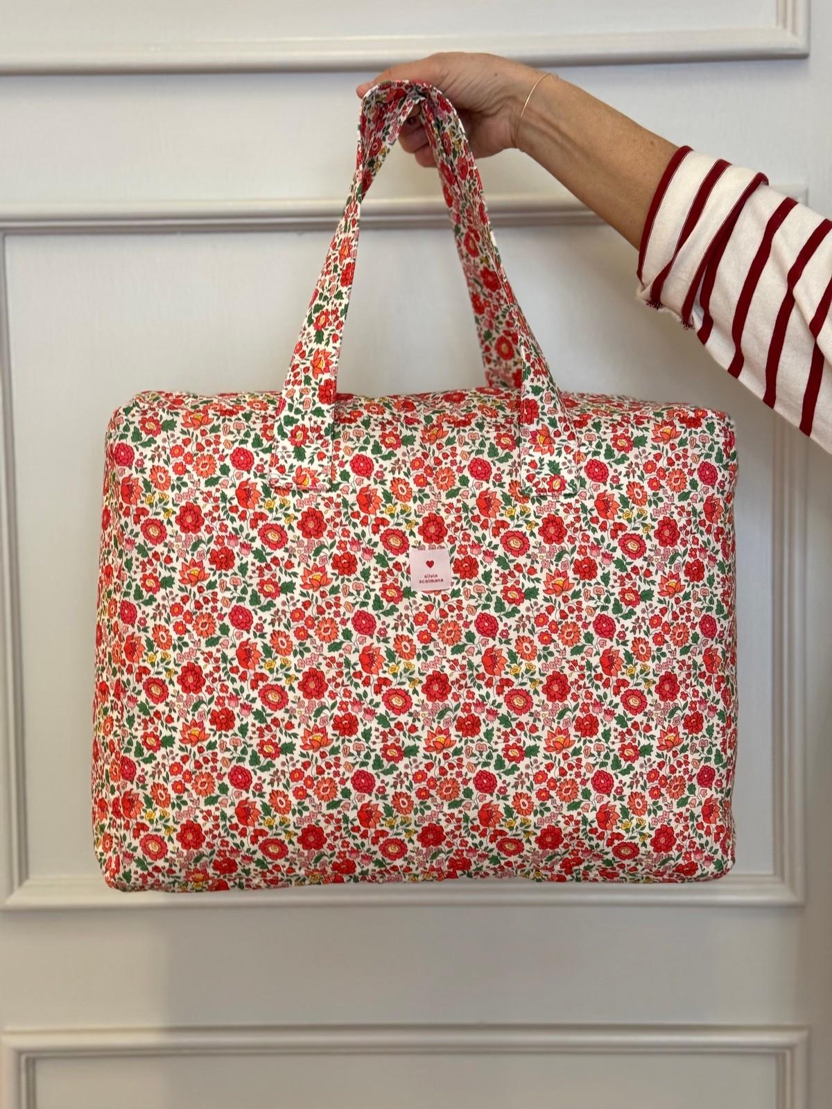 Valigia in tessuto Tana Lawn, disegno "D'Anjo" di Liberty London, cotone ultrafine dal tocco setoso. Imbottitura in tessuto trapuntato con doppia tasca interna. Dimensioni: 44x34x12 cm