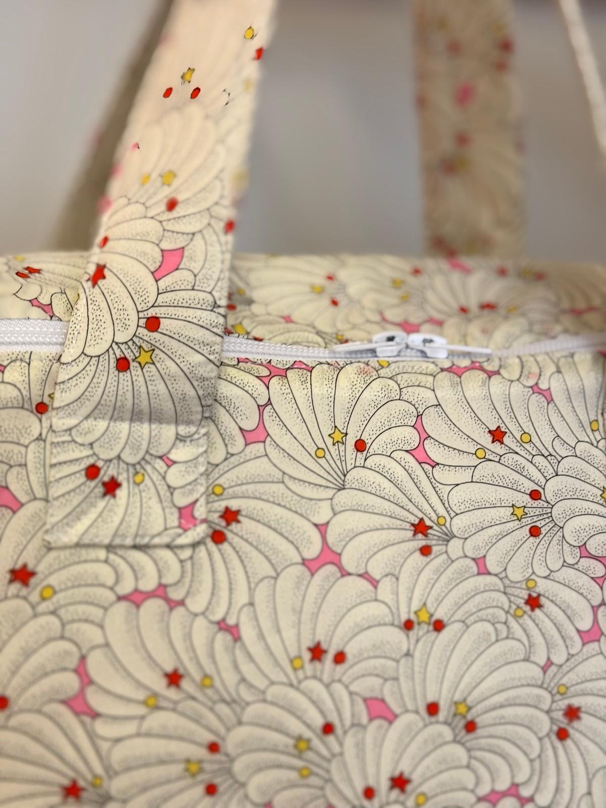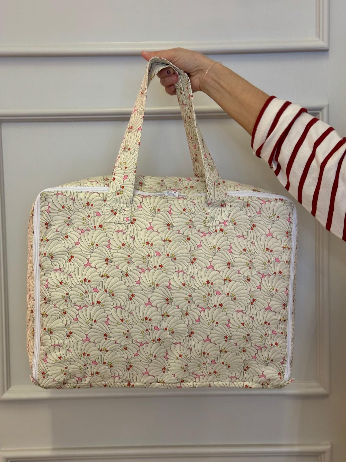 Valigia in tessuto Tana Lawn, disegno "Poiret Shell" di Liberty London, cotone ultrafine dal tocco setoso. Imbottitura in tessuto trapuntato con doppia tasca interna. Dimensioni: 44x34x12 cm