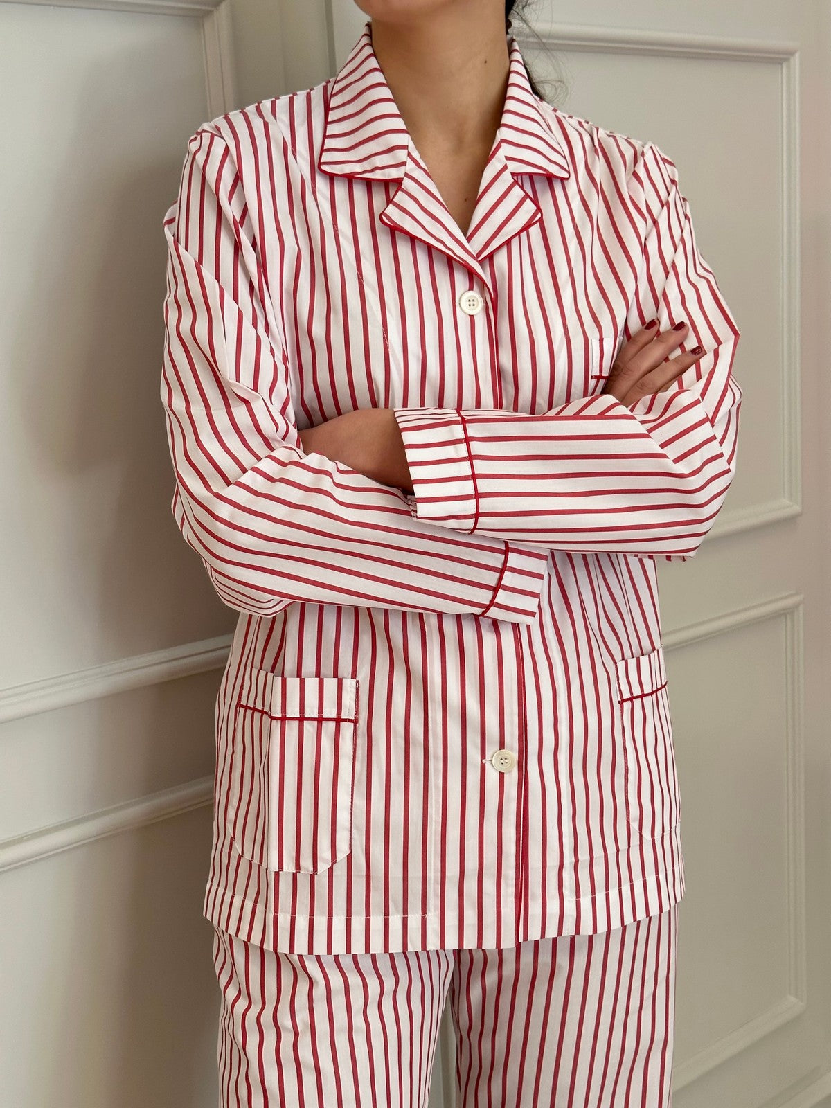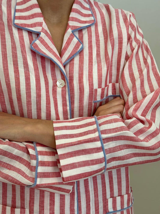 PIGIAMA DONNA IN LINO TAGLIATELLA ROSSA ROFILO AZZURRO