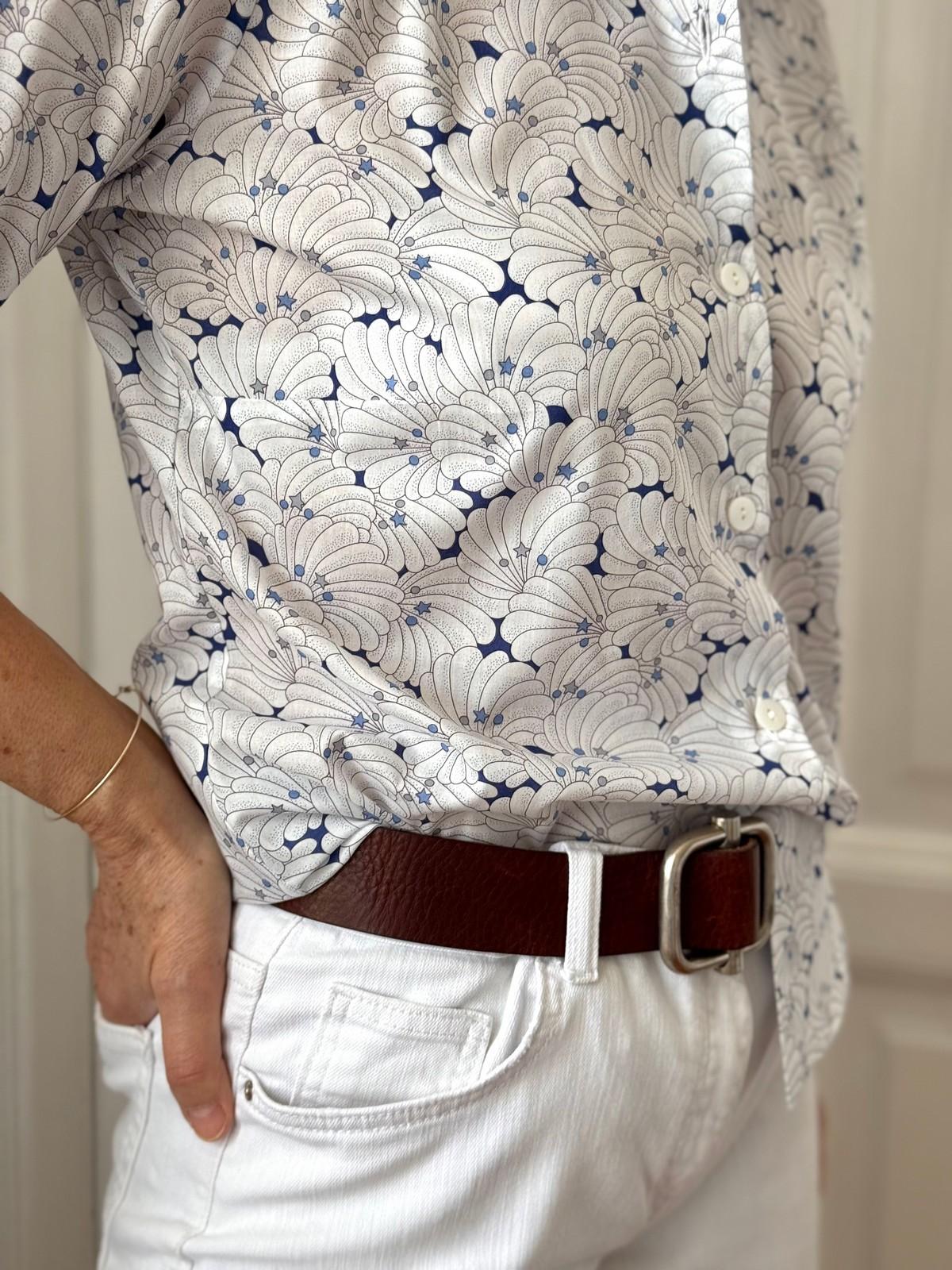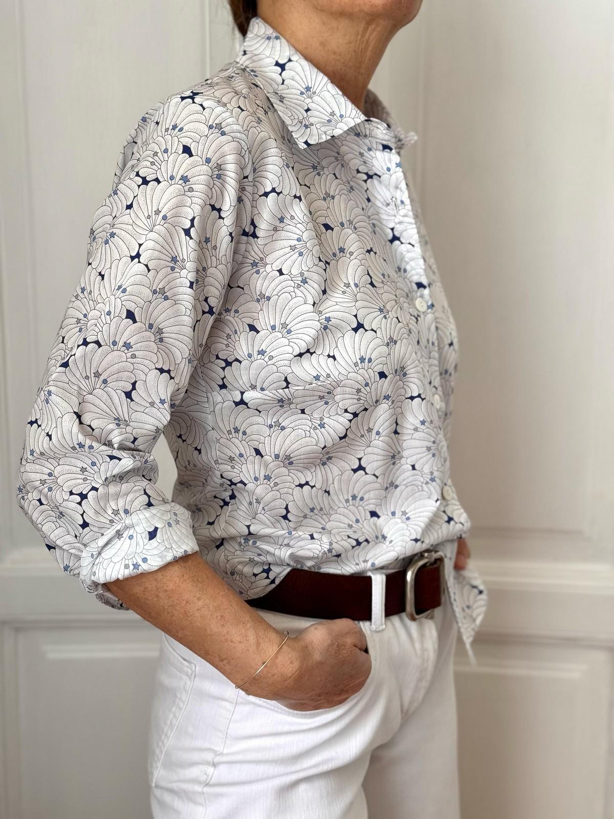 Camicia donna in tessuto Tana Lawn di Liberty London, disegno "Poiret Shell". Taglio classico. Chiusura con 6 bottoni in madreperla. Polsini con chiusura a due bottoni.