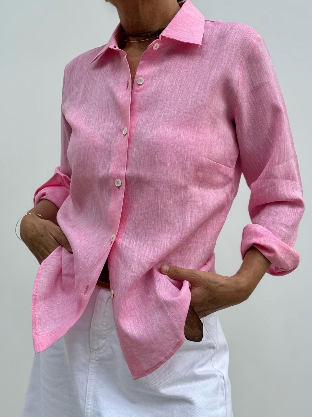 Camicia donna in puro lino. Taglio classico. Chiusura con 6 bottoni in madreperla. Polsini con chiusura a due bottoni.
