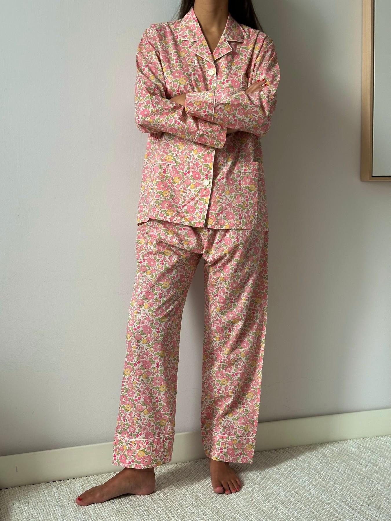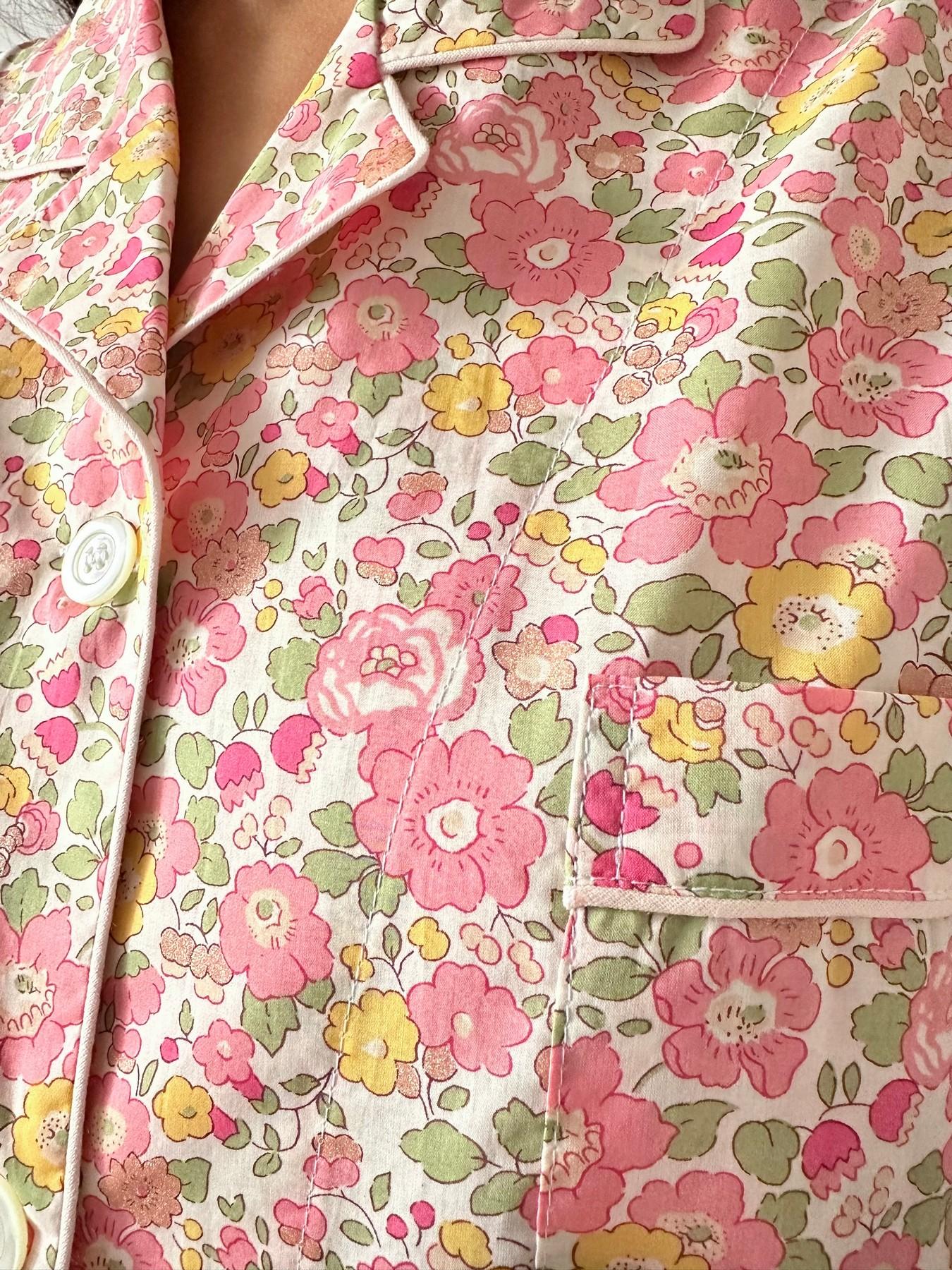 Pigiama donna in tessuto Tana Lawn, disegno "Besty" di Liberty London. Dettagli brillanti. Cotone ultrafine dal tocco setoso. Vestibilità morbida. Giacca 4 bottoni in madreperla, con 2 tasche e un taschino, profilo in cotone. Pantalone con elastico in vita.