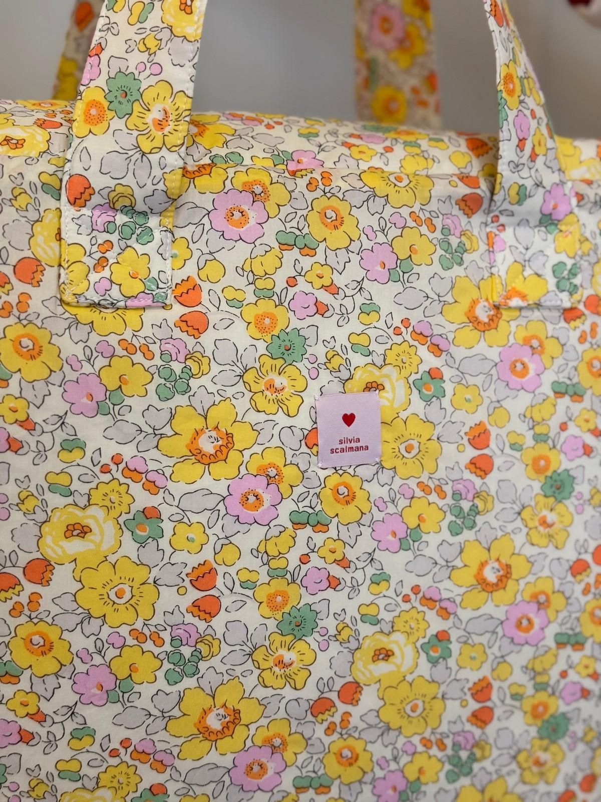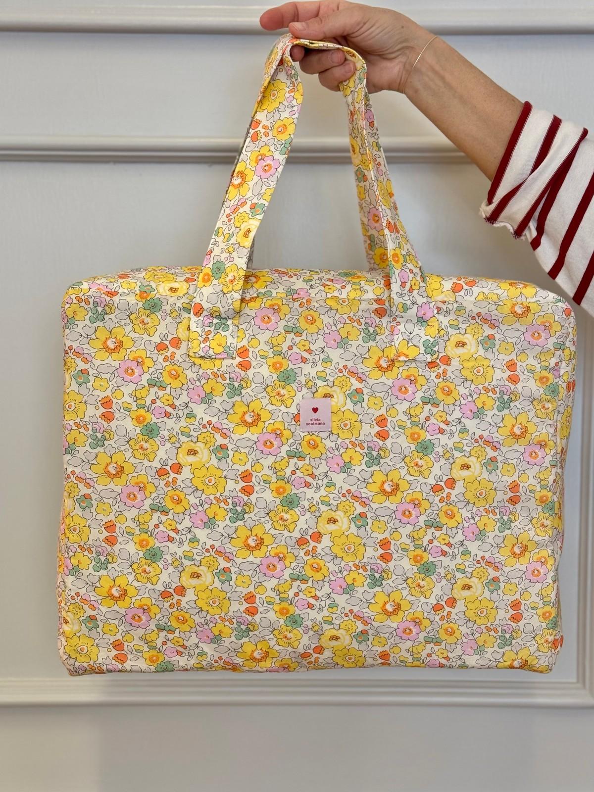 Valigia in tessuto Tana Lawn, disegno "Betsy" di Liberty London, cotone ultrafine dal tocco setoso. Imbottitura in tessuto trapuntato con doppia tasca interna. Dimensioni: 44x34x12 cm