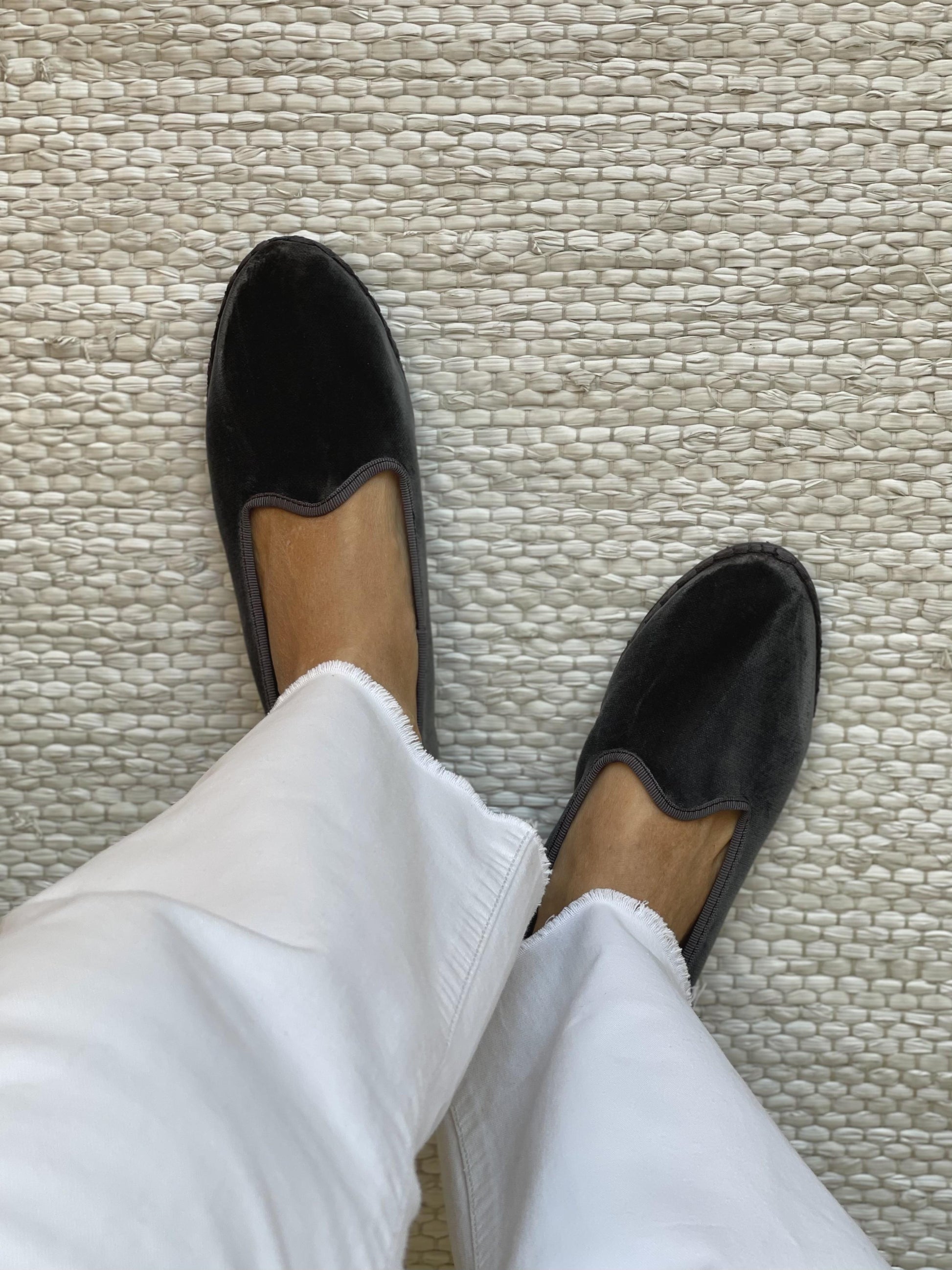 Friulane classiche con punta stondata, esterno in velluto di cotone e rivestimento interno in cotone bianco. Suola in gomma. Calzata ridotta.