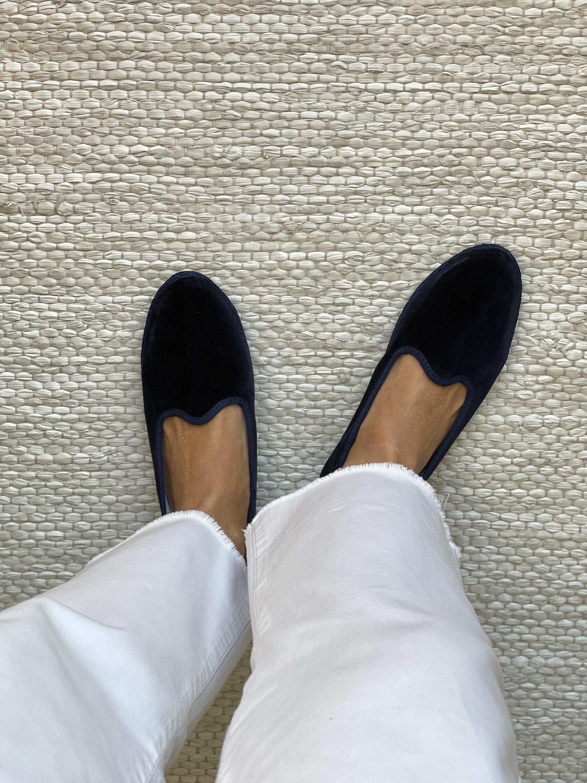 Friulane classiche con punta stondata, esterno in velluto di cotone e rivestimento interno in cotone bianco. Suola in gomma. Calzata ridotta.
