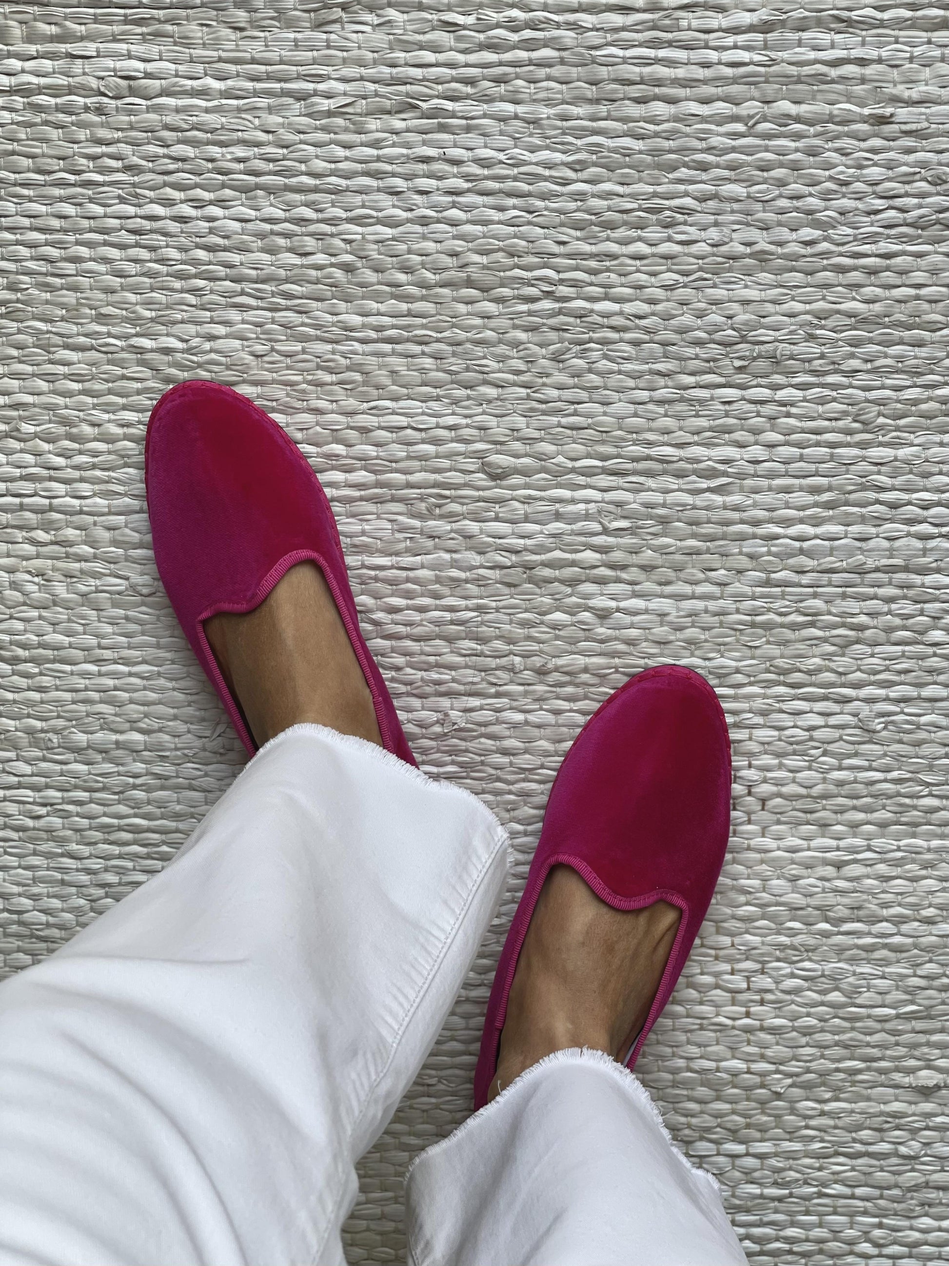 Friulane classiche con punta stondata, esterno in velluto di cotone e rivestimento interno in cotone bianco. Suola in gomma. Calzata ridotta.