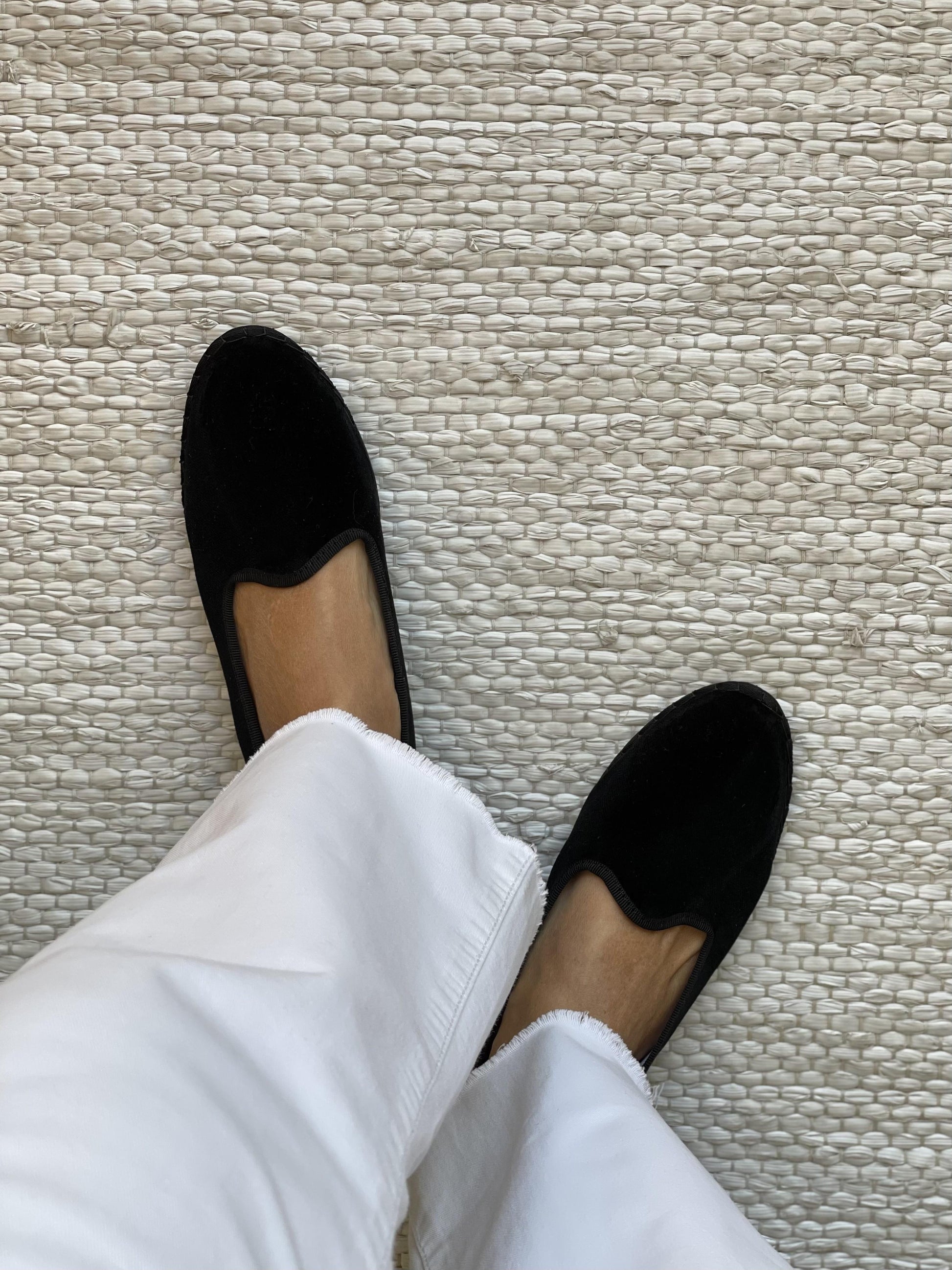 Friulane classiche con punta stondata, esterno in velluto di cotone e rivestimento interno in cotone bianco. Suola in gomma. Calzata ridotta.