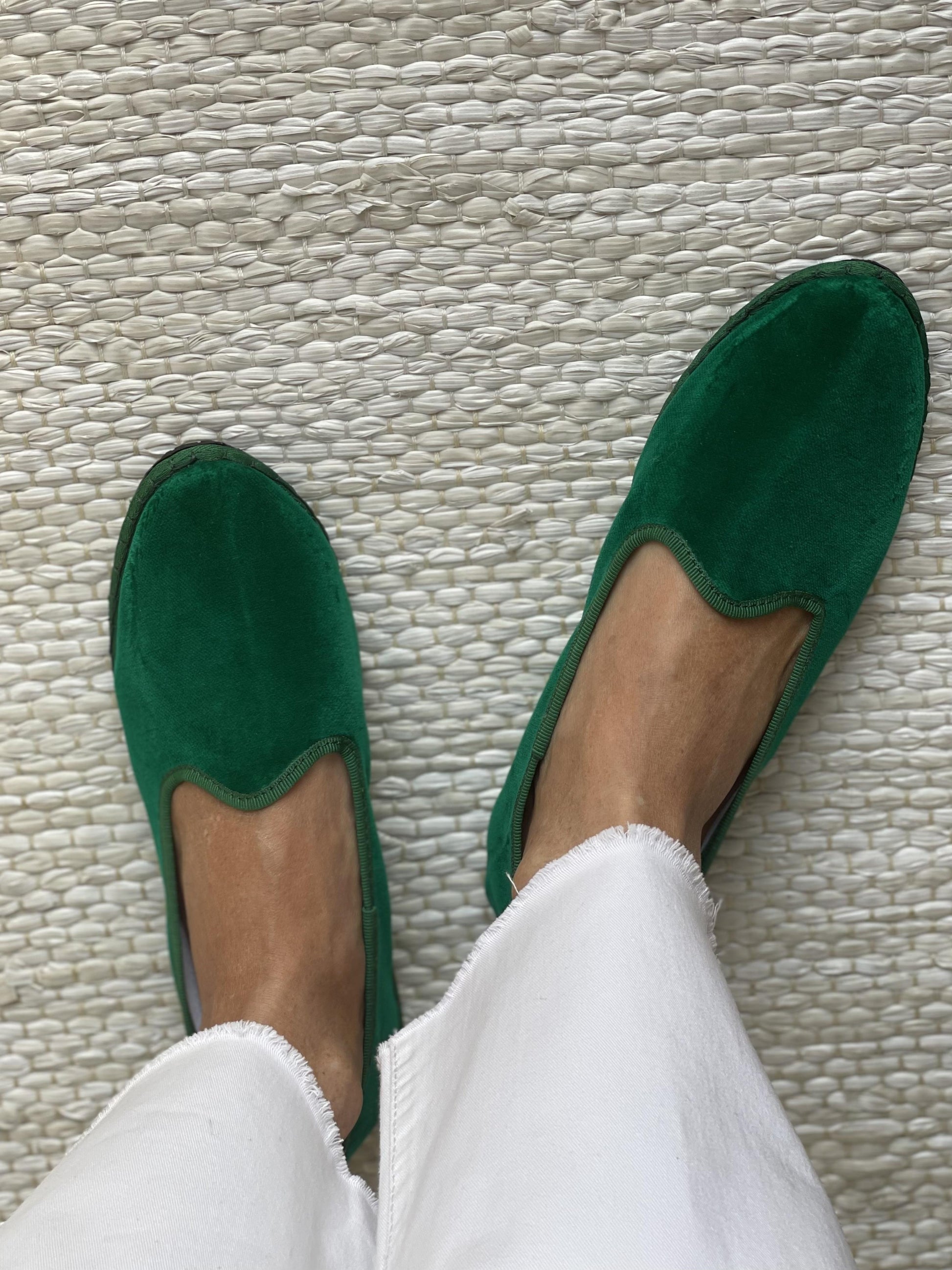 Friulane classiche con punta stondata, esterno in velluto di cotone e rivestimento interno in cotone bianco. Suola in gomma. Calzata ridotta.