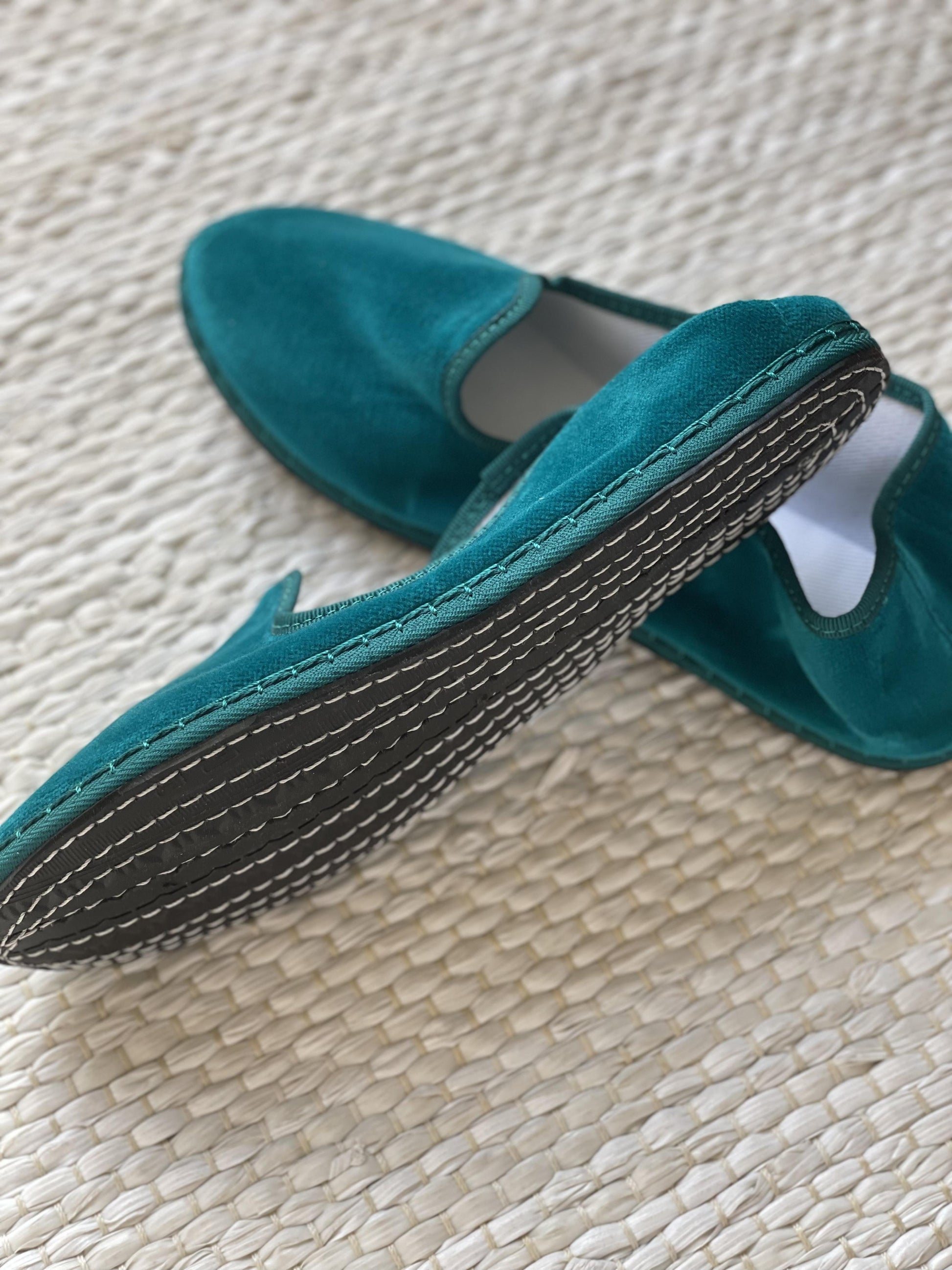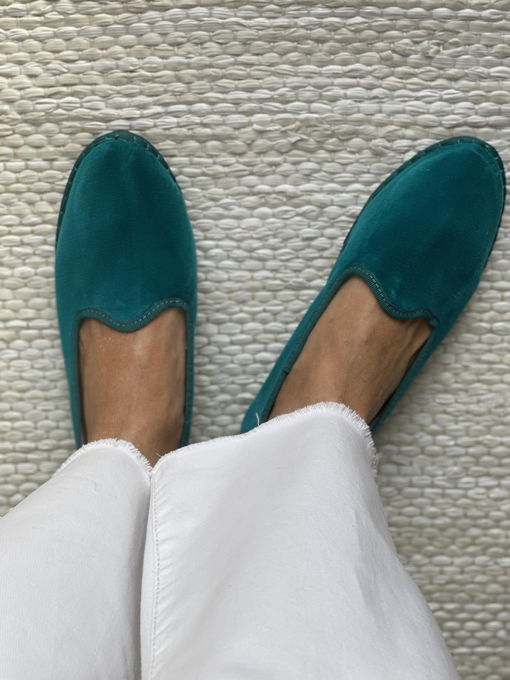 Friulane classiche con punta stondata, esterno in velluto di cotone e rivestimento interno in cotone bianco. Suola in gomma. Calzata ridotta.