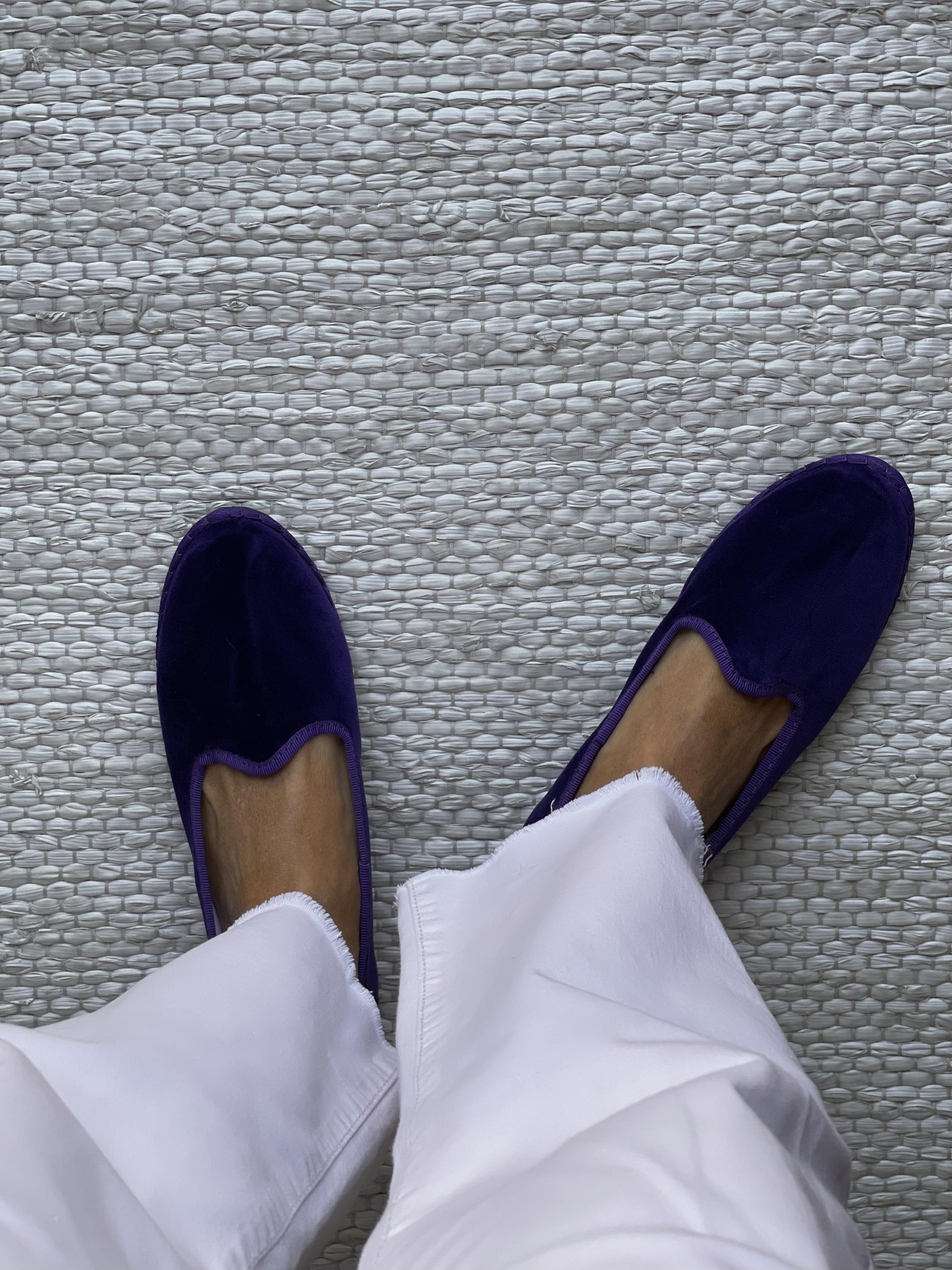 Friulane classiche con punta stondata, esterno in velluto di cotone e rivestimento interno in cotone bianco. Suola in gomma. Calzata ridotta.