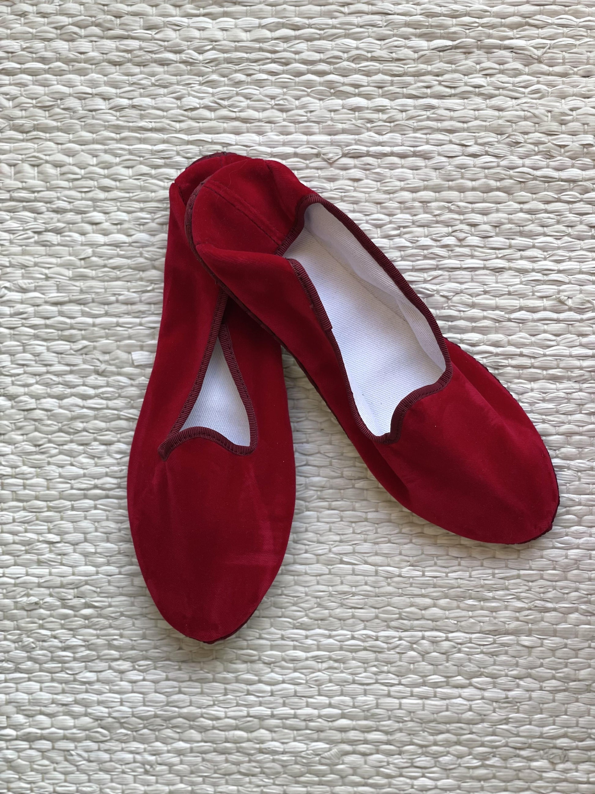 Friulane classiche con punta stondata, esterno in velluto di cotone e rivestimento interno in cotone bianco. Suola in gomma. Calzata ridotta.