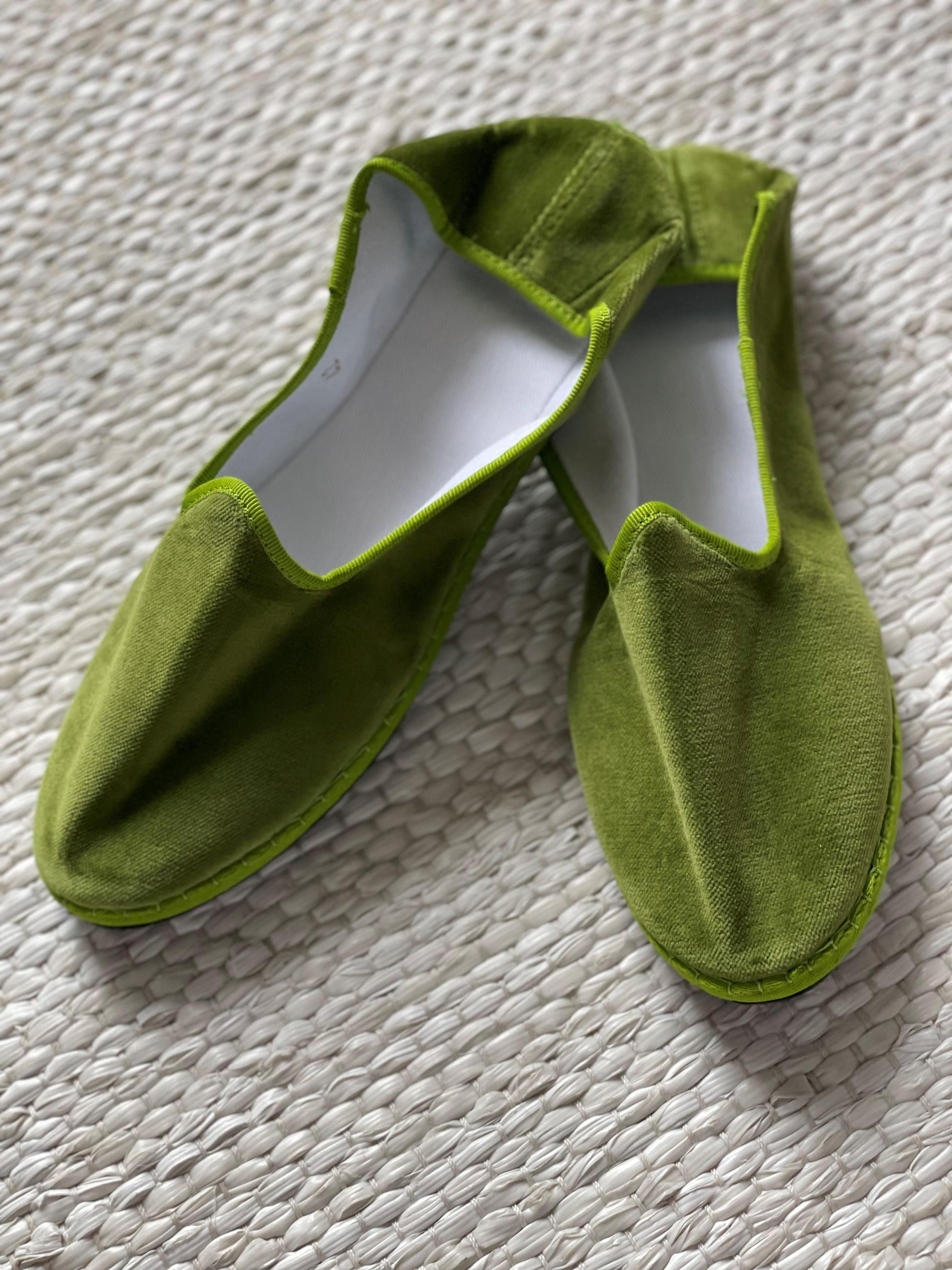 Friulane classiche con punta stondata, esterno in velluto di cotone e rivestimento interno in cotone bianco. Suola in gomma. Calzata ridotta.