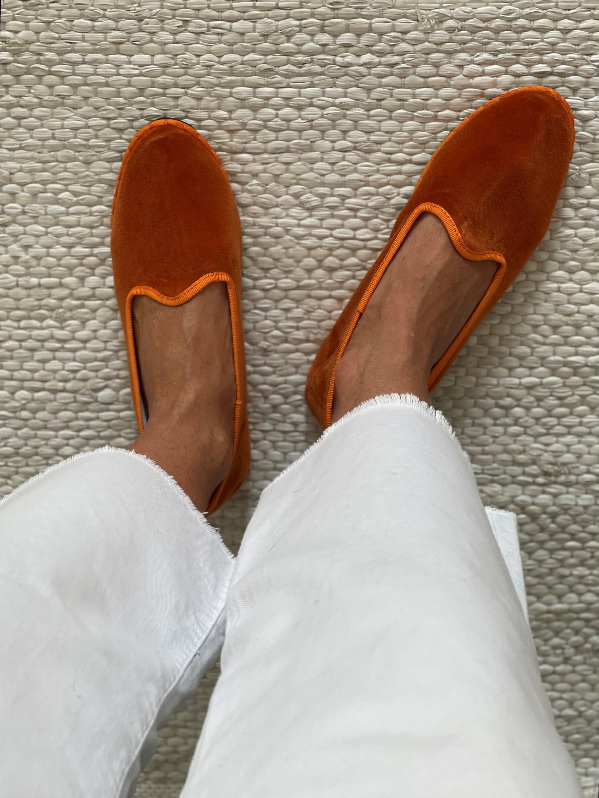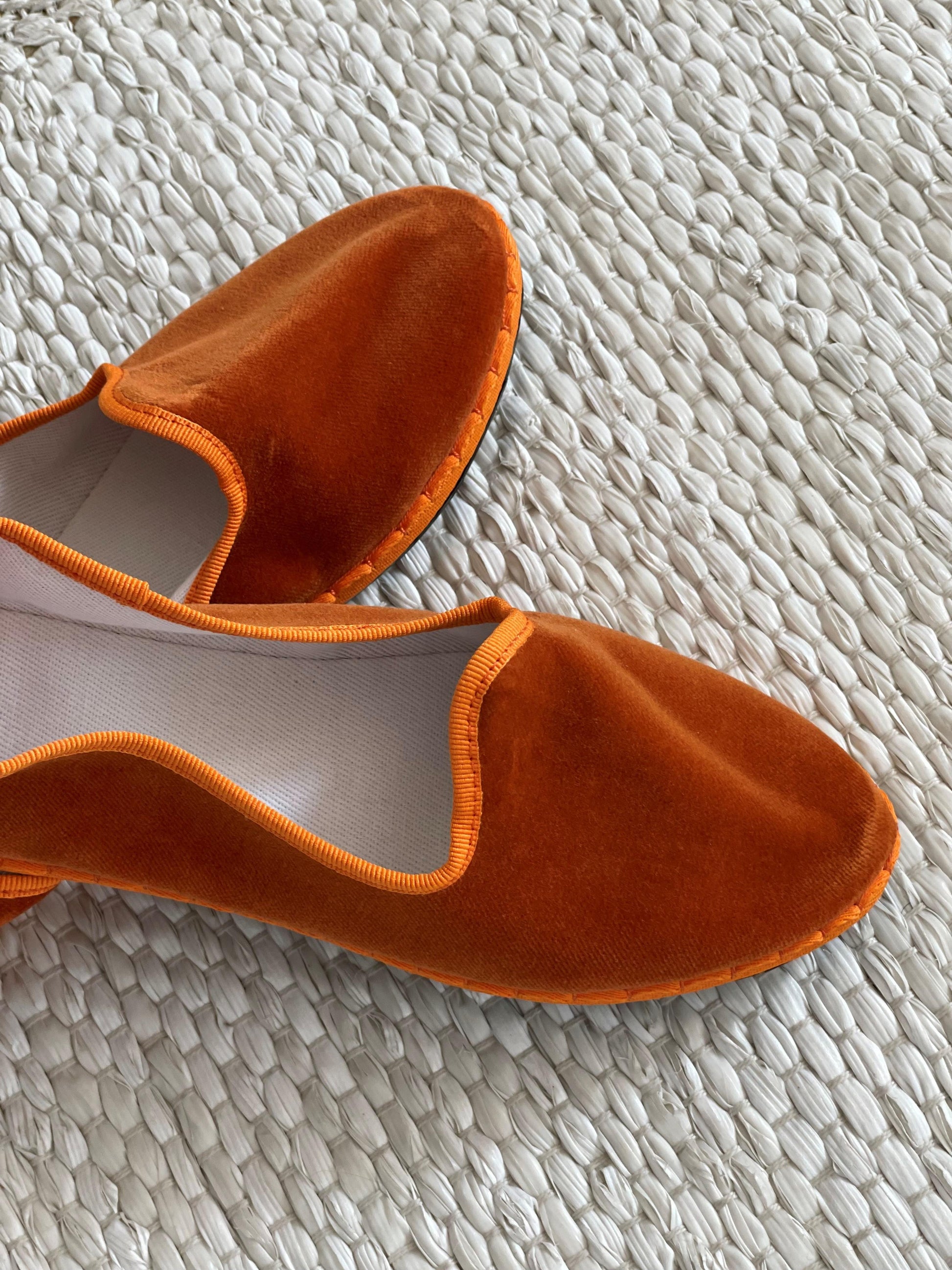 Friulane classiche con punta stondata, esterno in velluto di cotone e rivestimento interno in cotone bianco. Suola in gomma. Calzata ridotta.