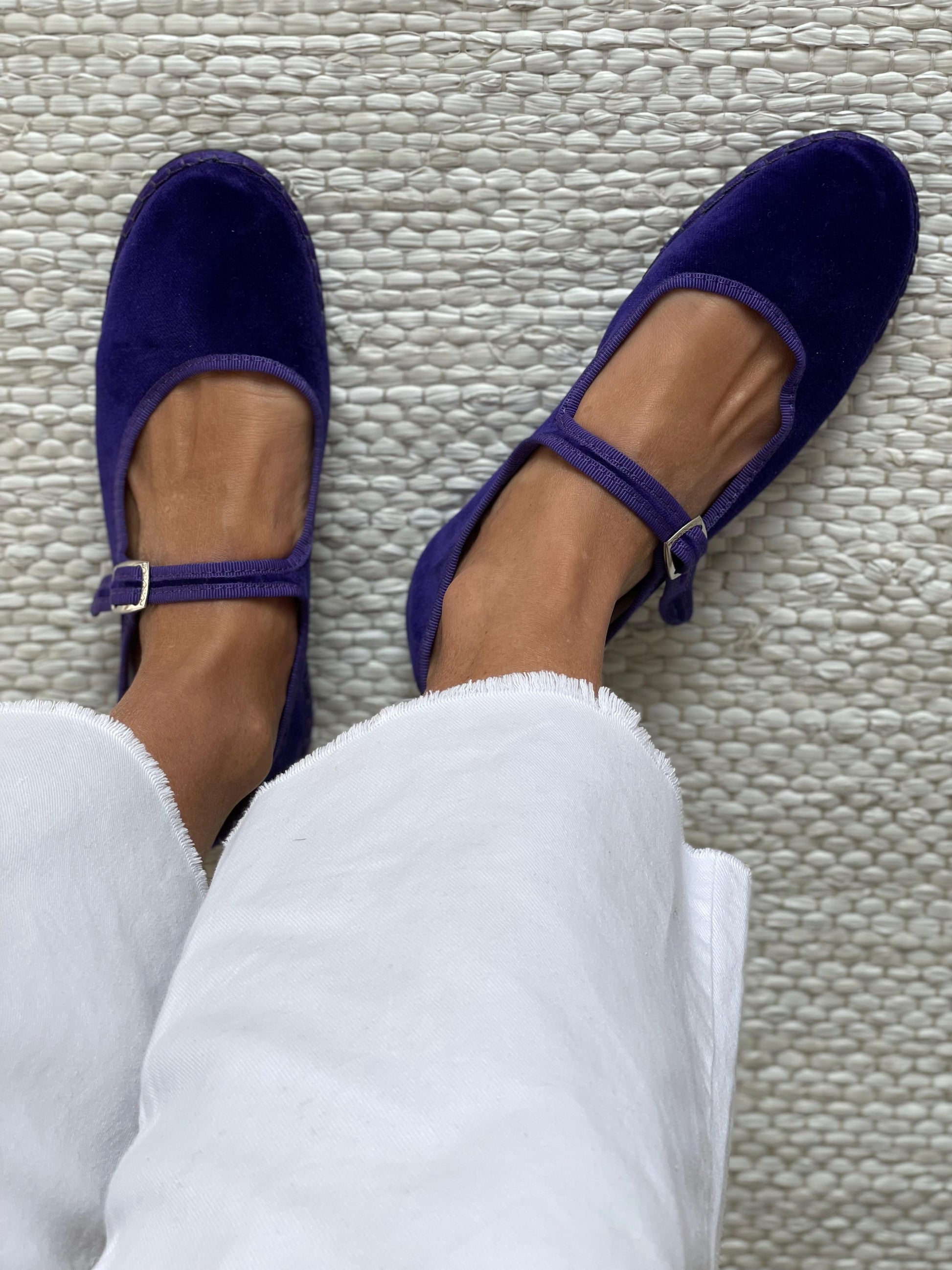 Friulane modello cinturino con punta stondata, esterno in velluto di cotone e rivestimento interno in cotone bianco. Suola in gomma. Calzata ridotta.