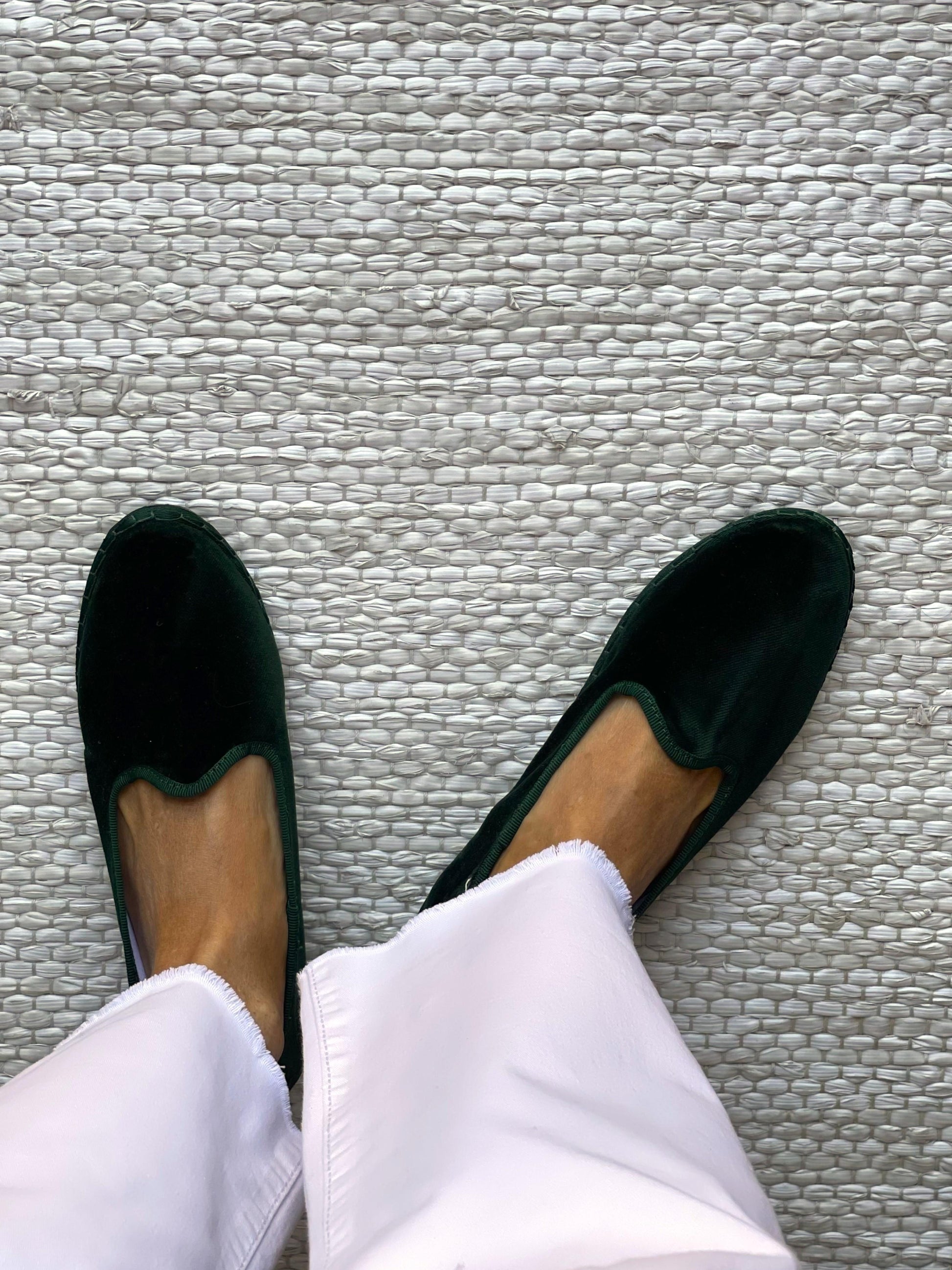 Friulane classiche con punta stondata, esterno in velluto di cotone e rivestimento interno in cotone bianco. Suola in gomma. Calzata ridotta.