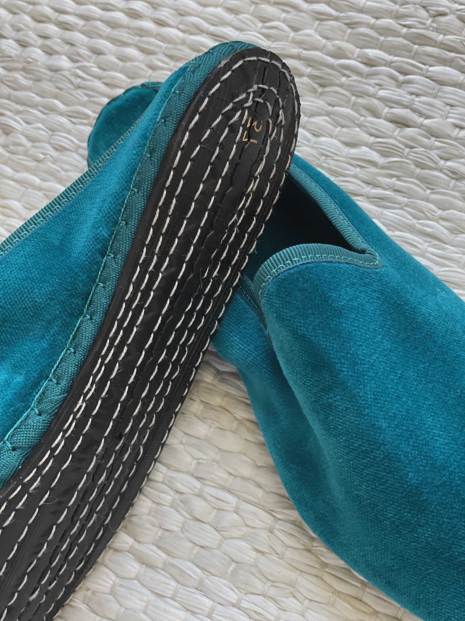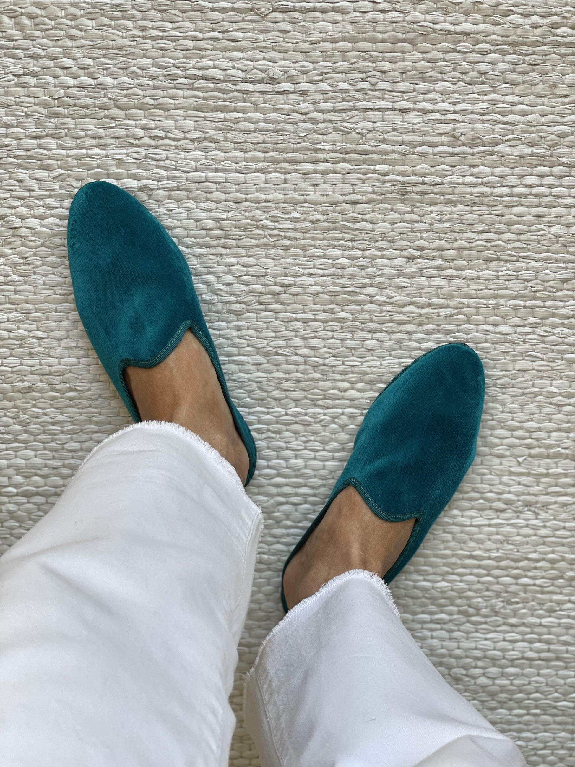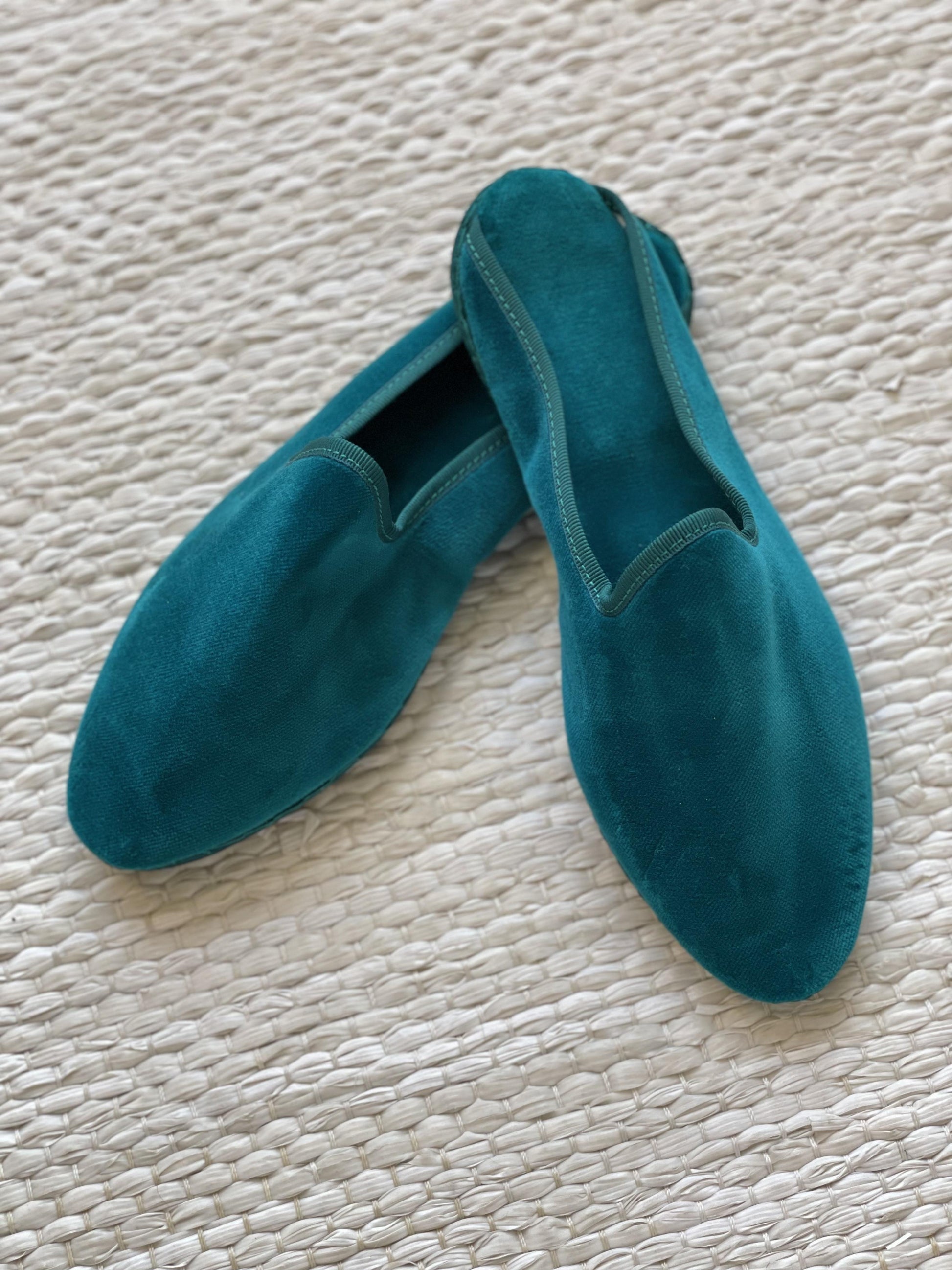 Friulane classiche con punta stondata, esterno in velluto di cotone e rivestimento interno in cotone bianco. Suola in gomma. Calzata regolare.