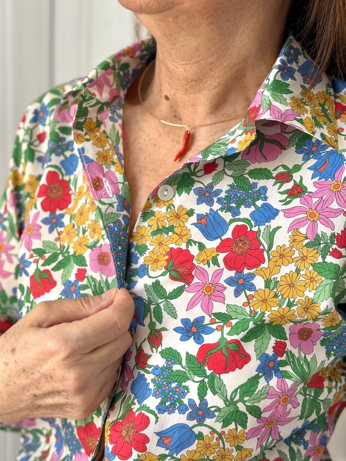 Camicia donna in tessuto Tana Lawn di Liberty London, disegno "Clarabell". Taglio classico. Chiusura con 6 bottoni in madreperla. Polsini con chiusura a due bottoni.