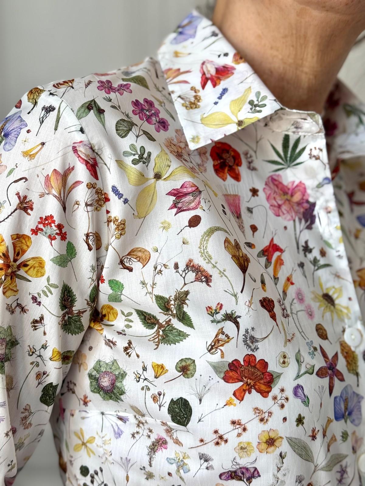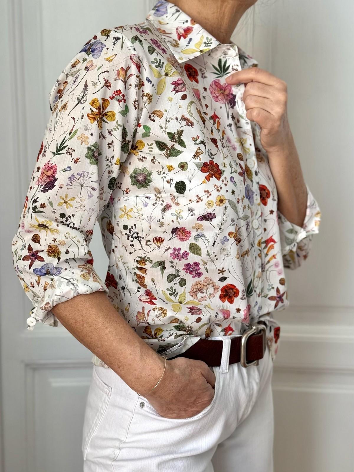 Camicia donna in tessuto Tana Lawn di Liberty London, disegno "Floral Eve". Taglio classico. Chiusura con 6 bottoni in madreperla. Polsini con chiusura a due bottoni.