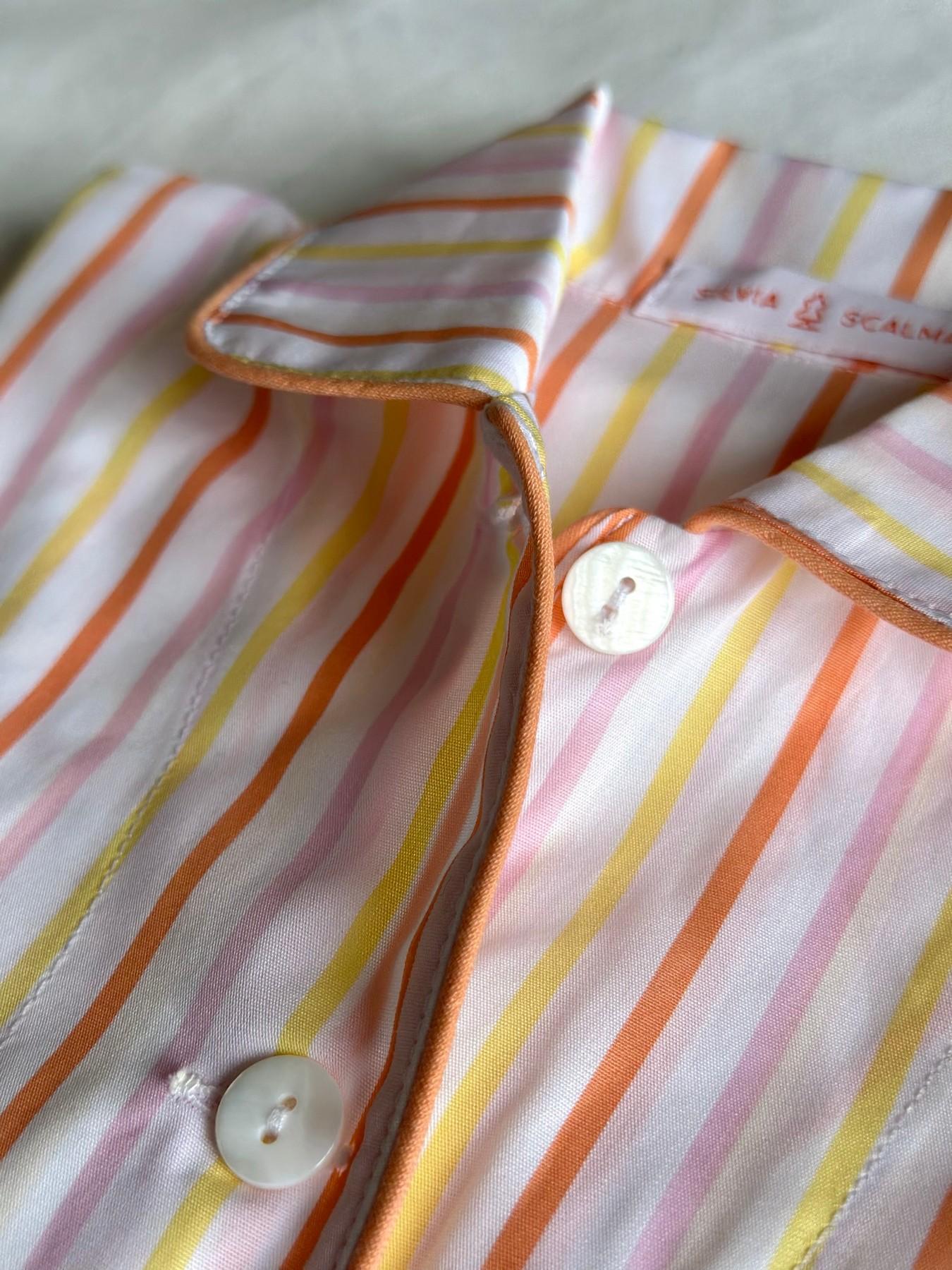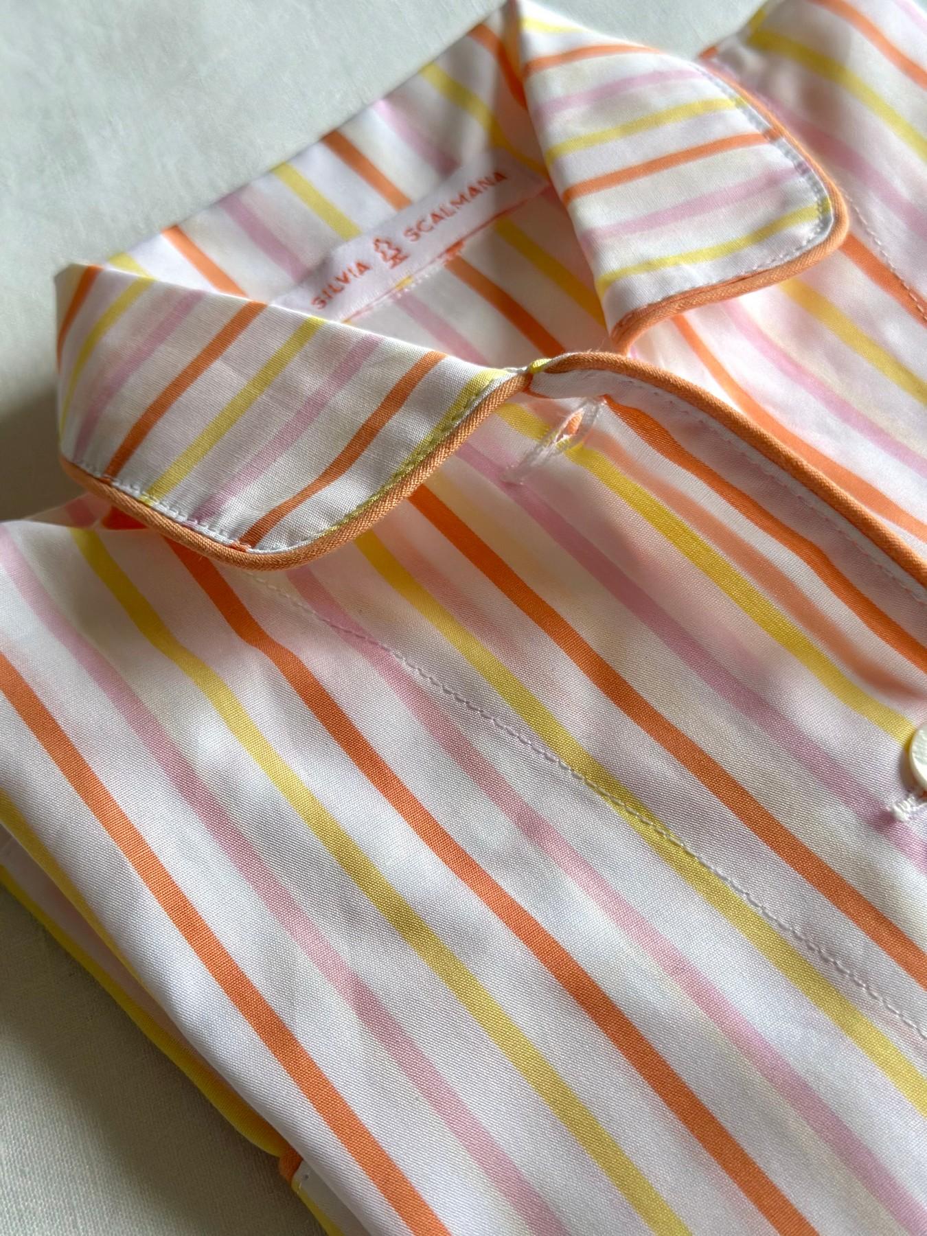 Pigiama in popeline puro cotone. Vestibilità morbida. Giacca 4 bottoni in madreperla, con 2 tasche e un taschino, profilo in cotone. Pantalone con elastico in vita.