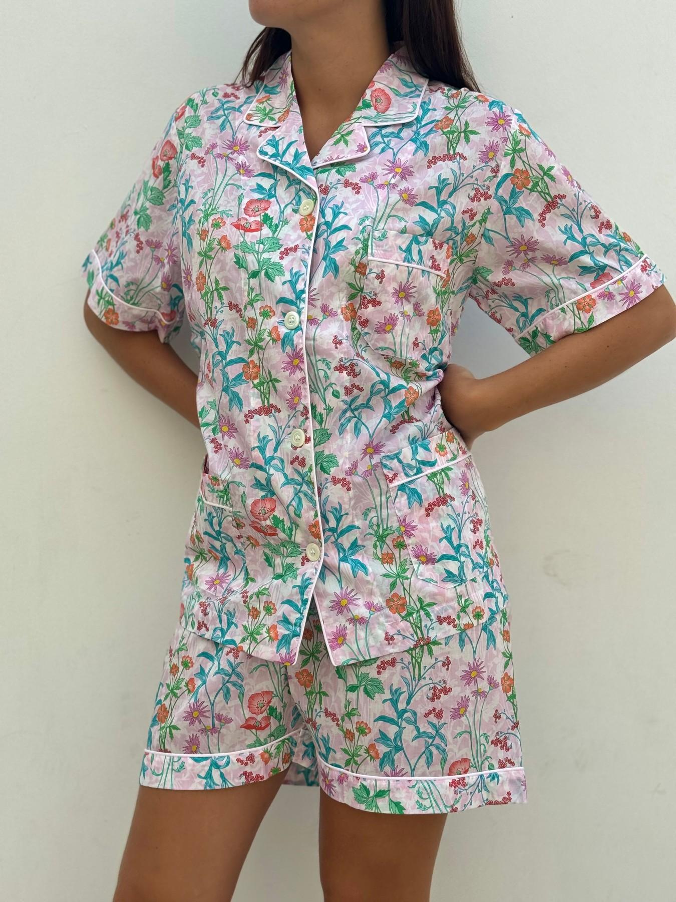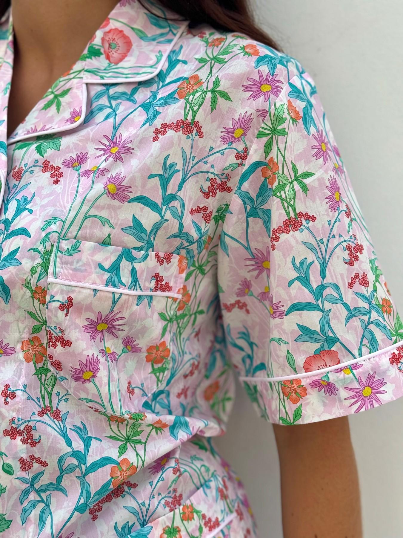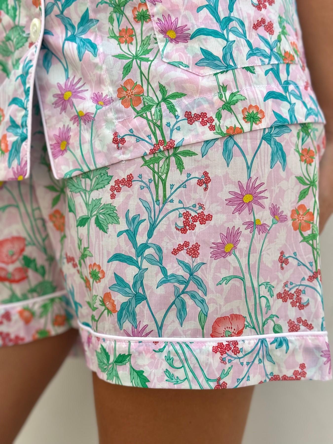 Pigiama corto donna in tessuto Tana Lawn, disegno "Ophelia" di Liberty London. Cotone ultrafine dal tocco setoso. Vestibilità morbida. Giacca 4 bottoni in madreperla, con 2 tasche e un taschino, profilo in cotone. Pantalone con elastico in vita.