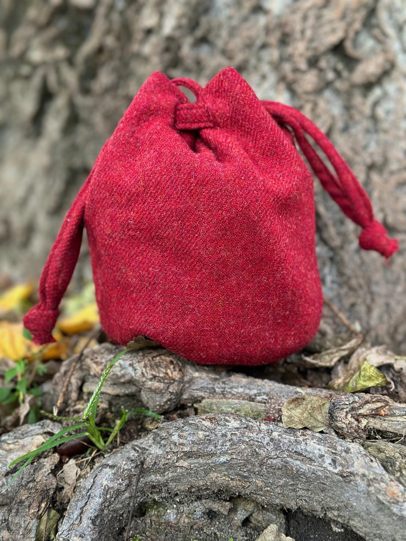 Borsina a secchiello in tweed con interno in tessuto Liberty London abbinato. Base diametro 14cm, altezza 21cm, lunghezza totale tracolla 121cm.