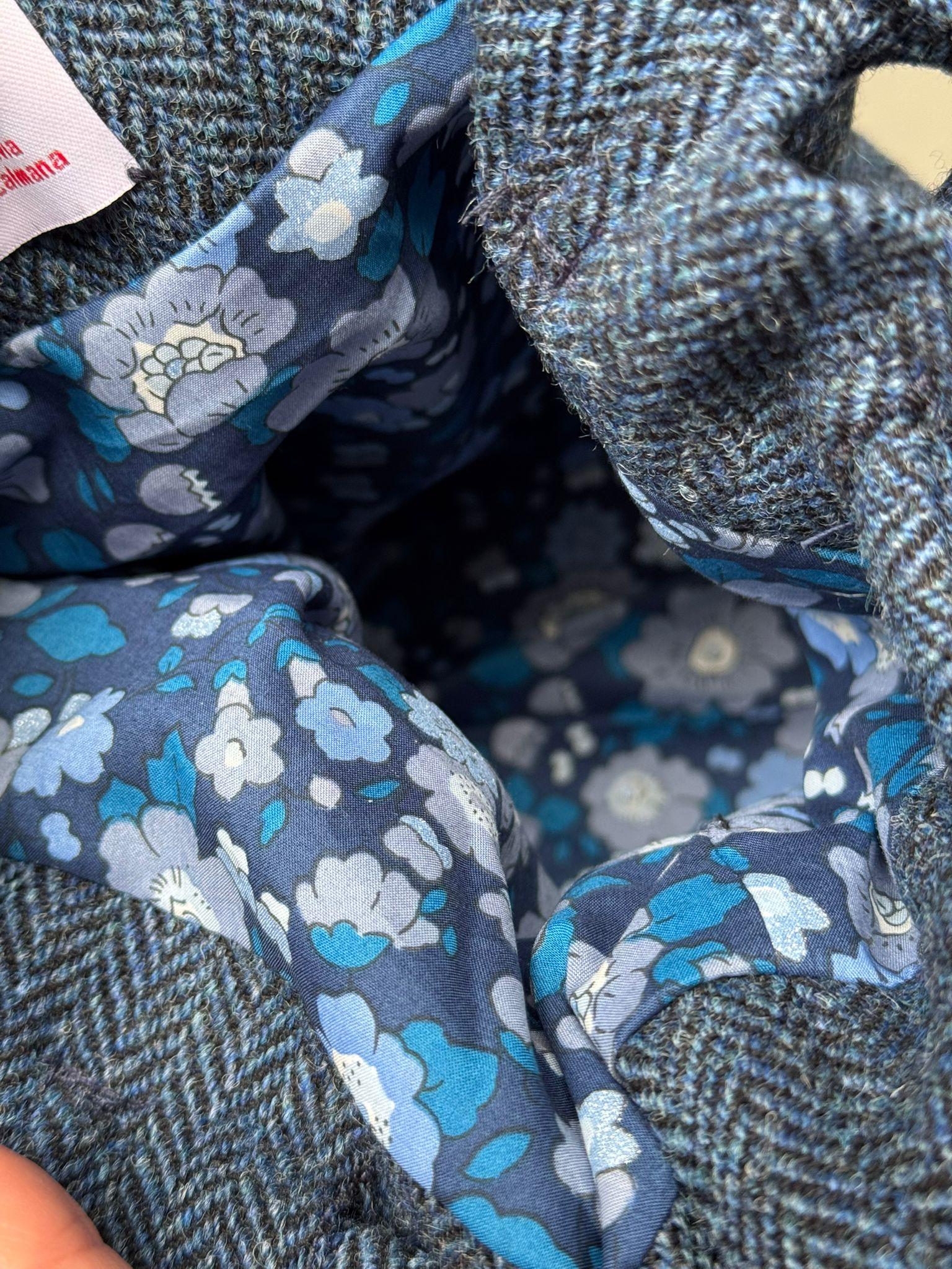 Borsina a secchiello in tweed con interno in tessuto Liberty London abbinato. Base diametro 14cm, altezza 21cm, lunghezza totale tracolla 121cm.
