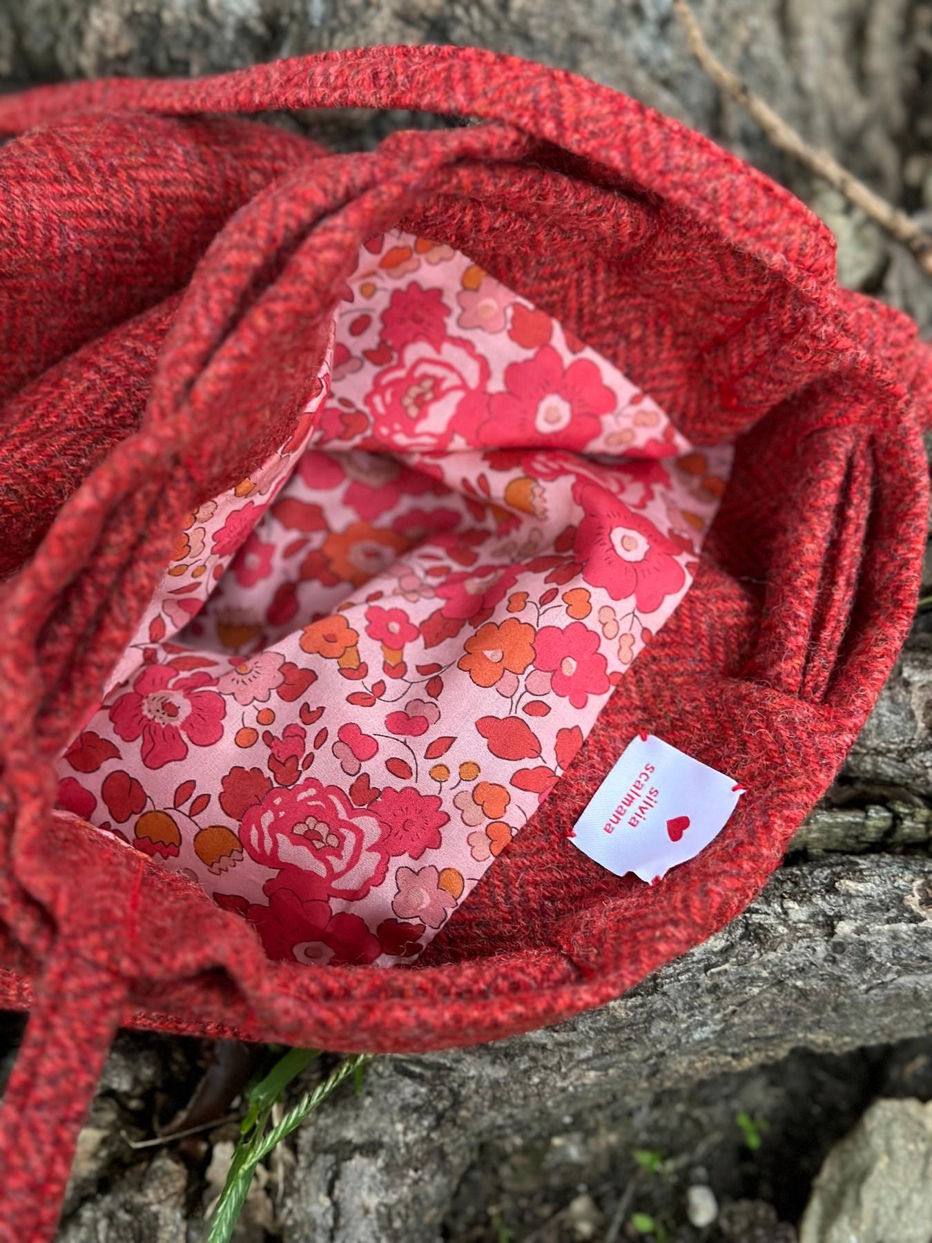 Borsina a secchiello in tweed con interno in tessuto Liberty London abbinato. Base diametro 14cm, altezza 21cm, lunghezza totale tracolla 121cm.