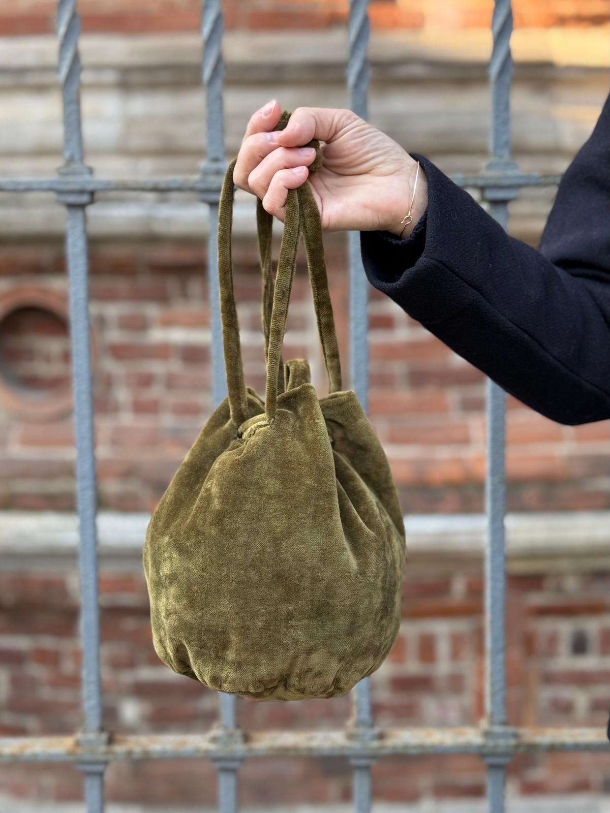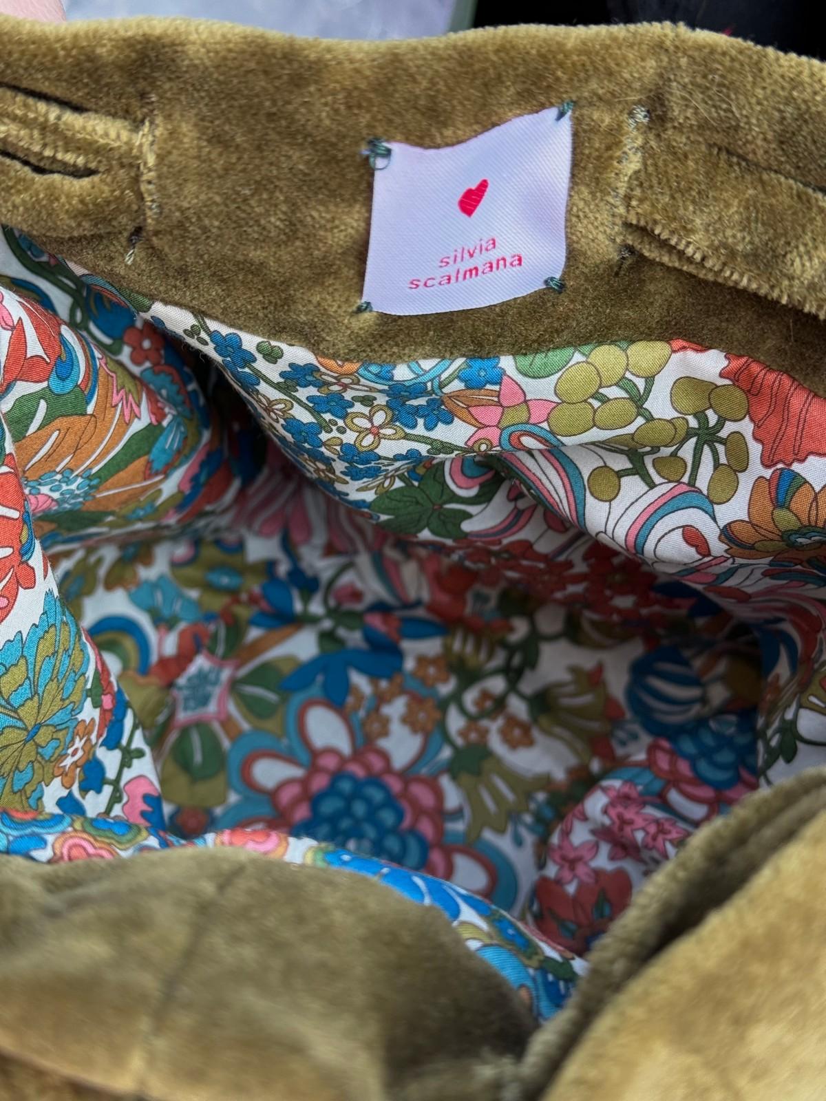 Borsina a secchiello in velluto con interno in tessuto Liberty London abbinato. Base diametro 14cm, altezza 21cm, lunghezza totale tracolla 121cm.