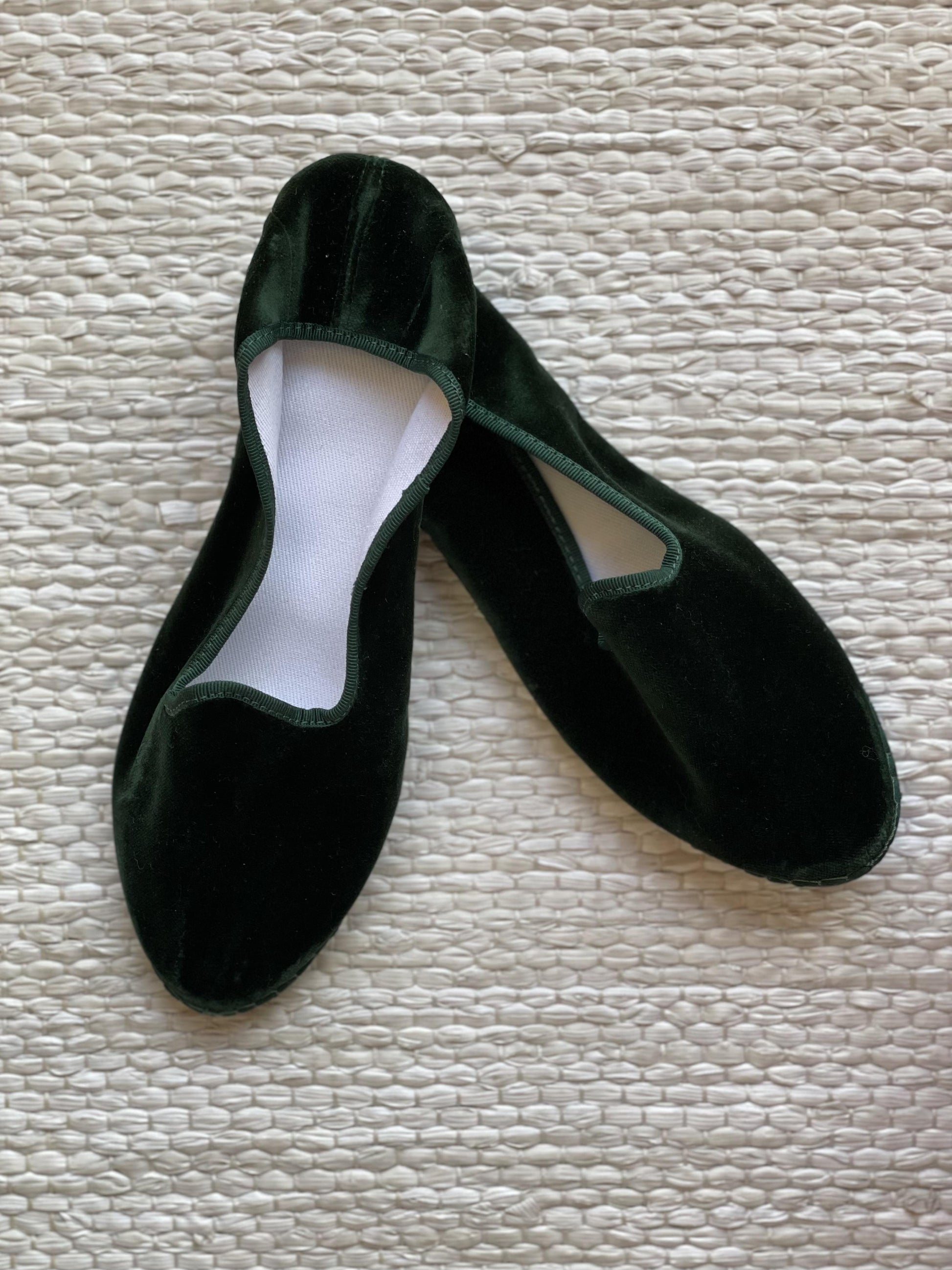 Friulane classiche con punta stondata, esterno in velluto di cotone e rivestimento interno in cotone bianco. Suola in gomma. Calzata ridotta.